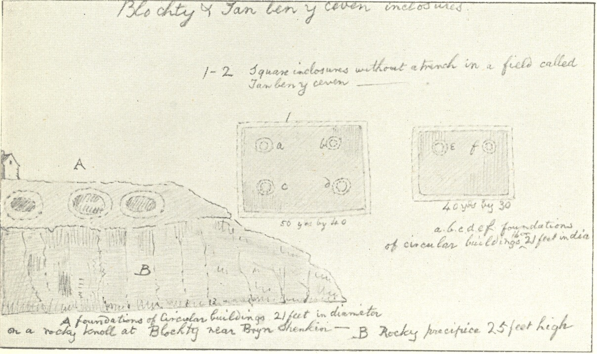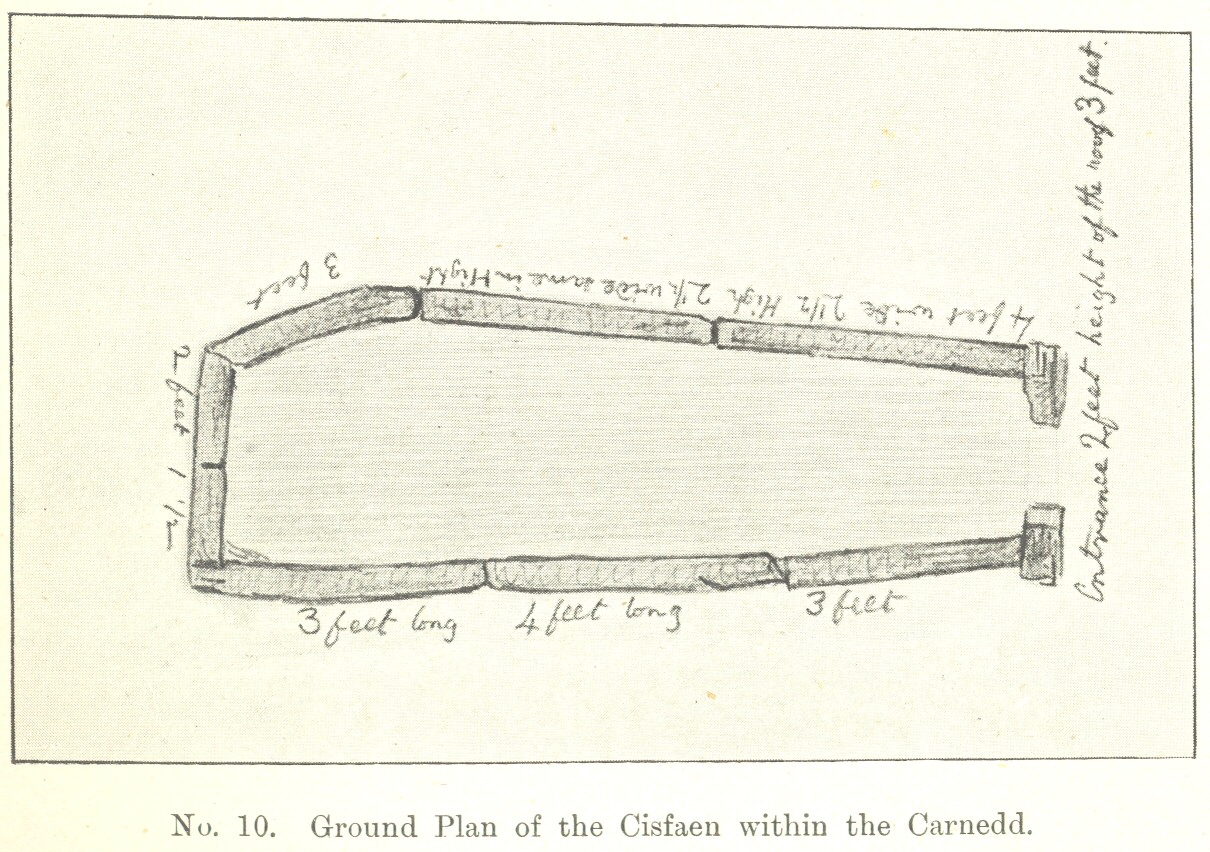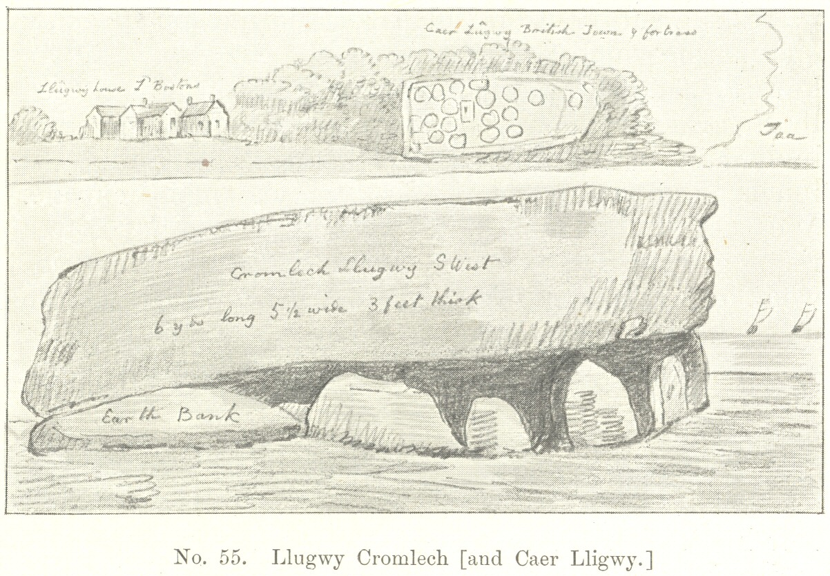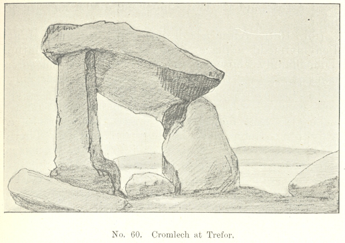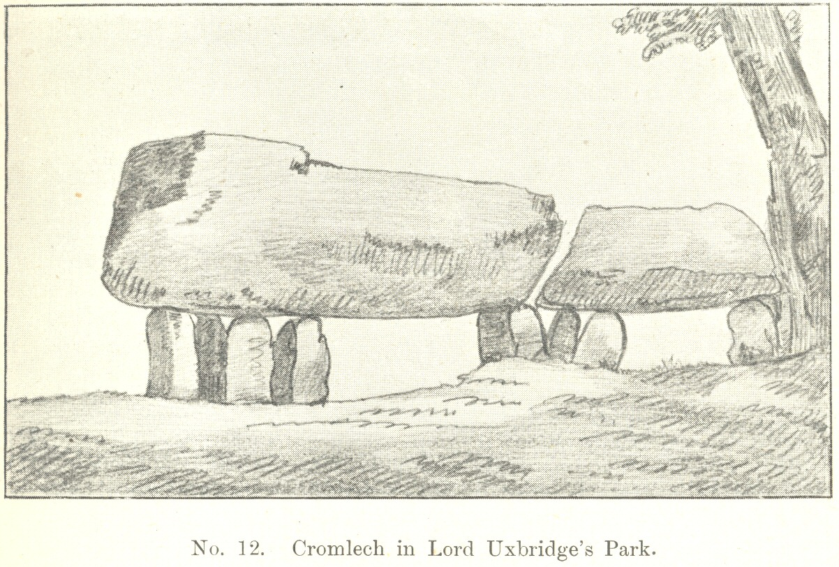 When arrived at Bodafon hills a ridge of rocky ground (fol. 117a) extending nearly two miles east and west Mr. Richards gave his horse to our attendant and accompanied us to a cromlech lying at the side of the hill denominated cromlech Lldercoch [73] nearly square the upper stone being about eleven feet across supported by four or five small uprights not above a foot and a half from the surface. This is by no means so perfect as some we have before noticed. Had not Mr. Richards been positive of the fact I should have doubted whether it had been designed for one. Arrived nearly at the summit of the hill we entered a cottage inhabited by a countryman whose grandfather p. 74and great grandfather resided there before him. Under the direction of this person we climbed to the top of the hill to look at a Carnedd. Most of the loose stones have been removed but some of the flat ones which composed the cistfaen are still on the spot, another more perfect lies about an hundred (fol. 118) yards to the eastward of this, a third further beyond which we did not visit. In the course of our walk the countryman pointed to a spot where he said his grand-mother whilst tending the cattle found a large triangular [74] piece of gold as he called it, standing on three supporters weighing nearly forty pounds. The antique overgrown with heath but one of the beasts happening p. 75to tread upon it occasioned the discovery. This she sold for three shillings at Llanerchymedd.