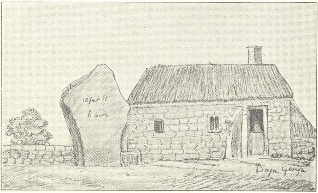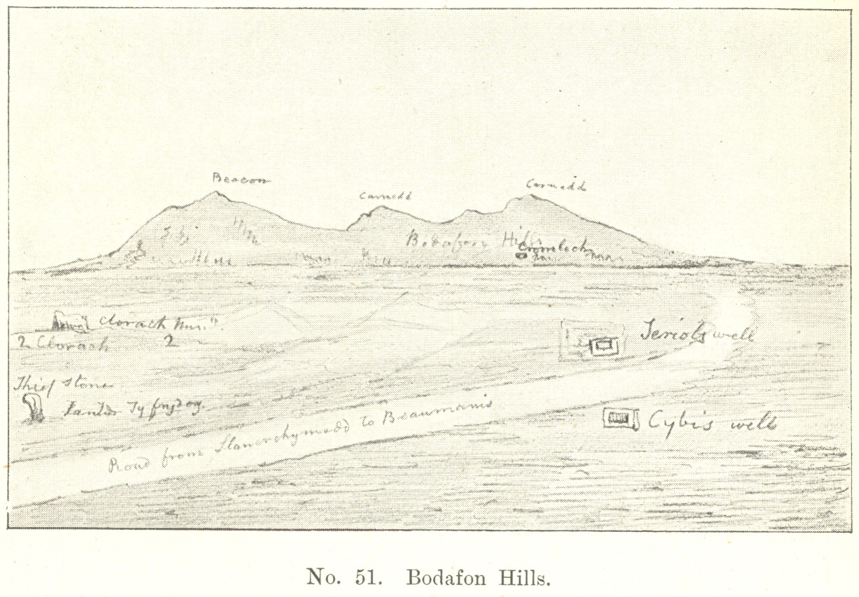 A little before seven called at Mr. Richards’s house whom we found waiting at the door ready to accompany us. He mounted his horse and we pursued the Beaumaris turnpike for half [72a] a mile when we turned to the left to look at a stone called Lleidr [72b] y Frydog or the thief stone. This is a rough stone about six feet high having a kind of hump or projection near the top. The country people report that a thief who had stolen some books from a neighbouring church was in this place turned into stone with the sack containing his theft laying over his shoulder. About a quarter of a mile further Mr. Richards pointed to the spot where formerly stood the nunnery of Clorach or St. Claire and not far from it by the road side we saw two wells whose waters were enclosed in a square reservoir of stone work. Tradition says that the two saints Seriol p. 73and Cybi (the former having a cell at Priestholme the latter at Holyhead where he founded a collegiate church) used to hold their weekly meetings at these springs to consult on religious matters, and from the circumstance of Seriol’s travelling westward in the morning and eastward in the evening, and Cybi on the contrary always facing the sun they were denominated