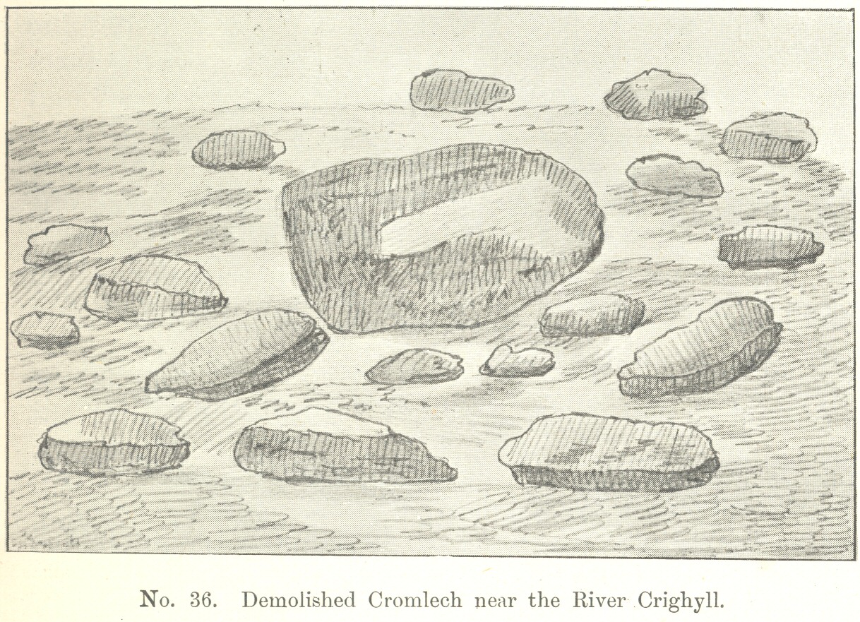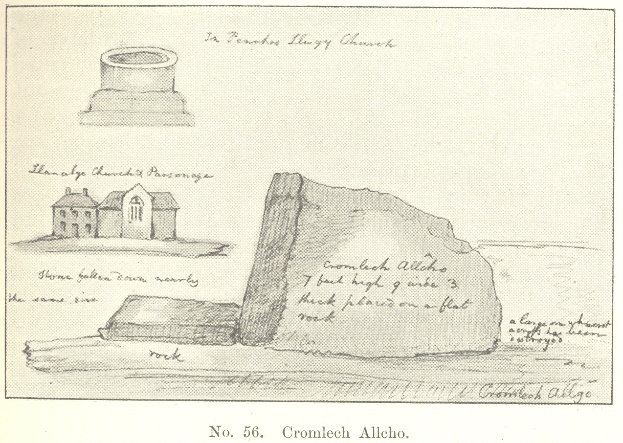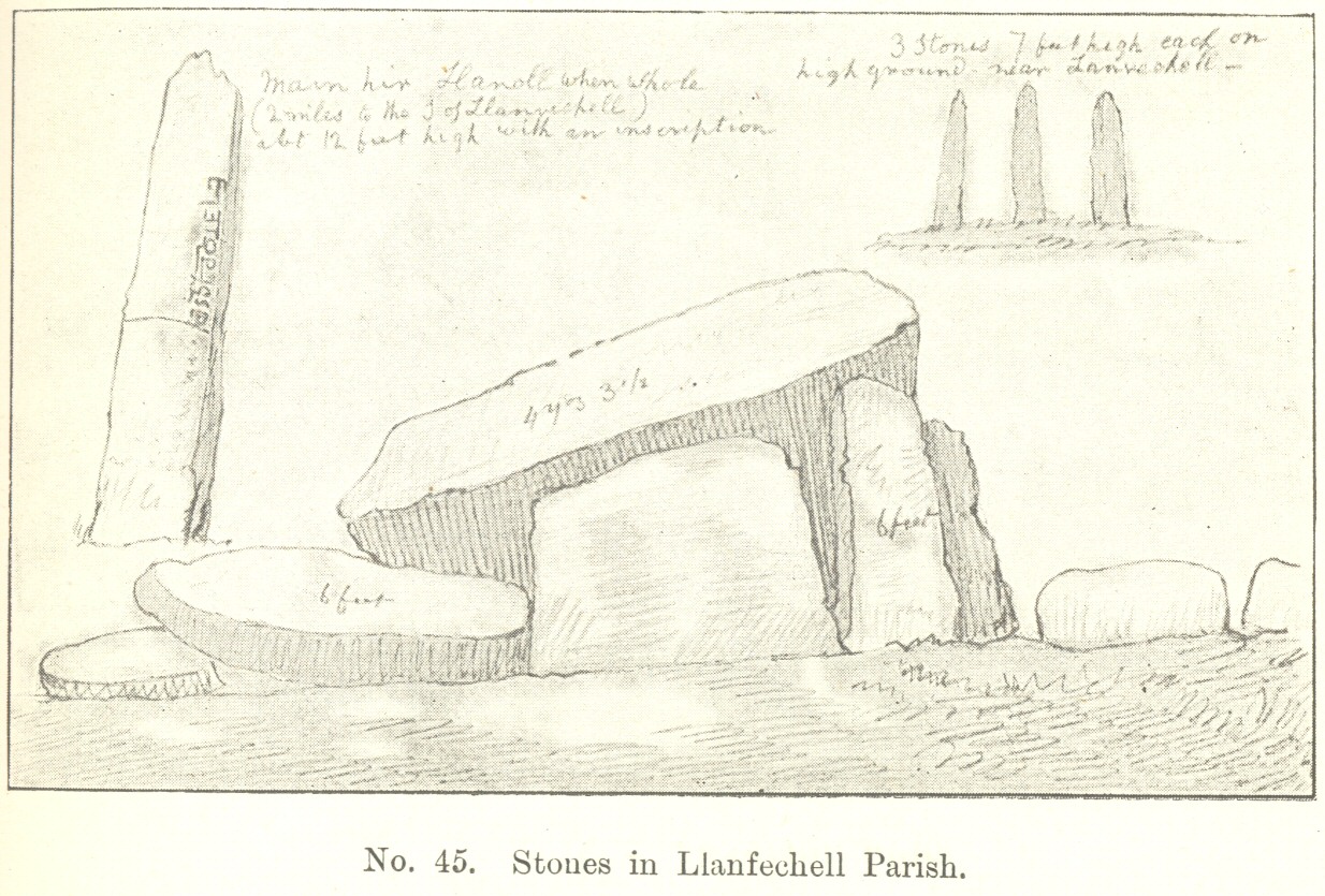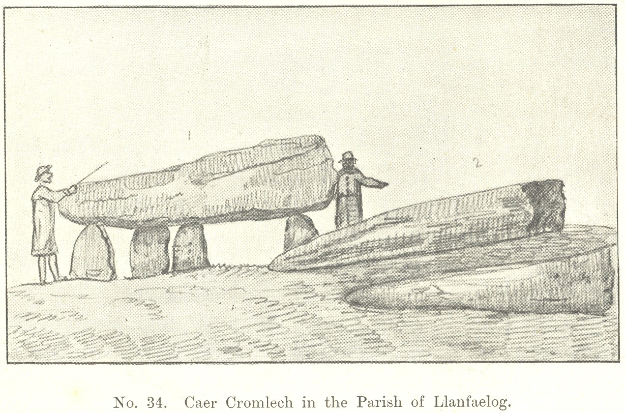 After having given something to him we were not a little glad to take our leave it being (fol. 127) past two, and there was a doubt whether we could procure accommodation for the night nearer than Beaumaris at p. 82least twelve miles distant. Passed a stone about seven feet high nine long and three thick this is placed edgeways on a flat rock, another about the same shape and dimensions lies on the ground near at hand. A third formerly placed across has been destroyed within the memory of some of the inhabitants. These stones are called Cromlech but I should rather imagine like those we noticed at Llanfechell that it had constituted the chamber of a large Carnedd. Proceeding hence we walked over a natural layer of lime stones extending for some acres along the surface of the ground this is called Marian Glâs a term expressive of flat grey stones. We here met with a countryman who joined our party and in our progress pointed out some more of the Cytiau Gwyddellhod on (fol. 127a) a rising ground called Bryn [82] ddiol, and from hence we saw a hill about two miles to the westward named Rhos Fawr where he said were some other remains and cromlechs but this lay so much out of our direction we could not visit them. At Marian Mawr Mr. Richards quitted us. We were indeed much indebted to him for his polite attention in accompanying us thus far for I am convinced that without his assistance we should have passed many of these curious remains the common people in general being ignorant of everything of the kind. This gentleman seems to have paid a good deal of attention to antiquities and has promised to favour me with a letter on the subject on my return home. But I could not help remarking in the course of conversation that superstition does not seem confined to the ignorant and illiterate for he told me very gravely (fol. 129) that there were companies of fairies still existing in Wales and particularly in Anglesea and that he had frequently driven them from their haunts. He also spoke of the knockers supposed to be little invisible beings favourable to the miners who by making a variety of sounds underground lead p. 83them to those places where there is the greatest quantity of ore. I could only be silent when I heard these opinions advanced but he has directed me to a book lately published by Mr. Edmund Jones of Pontypool on the subject. At Marian Mawr are six large stones of the same kind as the substrata rising above seven feet. They have obtained the name of cromlech but I rather imagine them to be natural productions.
