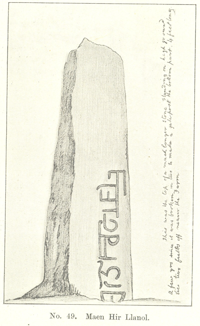 Continuing from hence and passing by the magic stone which had drawn us so much out of our way the preceeding night we called at the treasure dreamer’s cottage as he had promised to shew us an inscription which (fol. 111a) he knew to be worthy of notice as a clergyman of Llanerchymedd had been to copy it. He was from home but his wife catching up her half grown child in her arms walked before us at such a rate we could scarcely keep up with her to the field where it stood. We here found some characters and just as I was preparing to take the impression of them with putty so violent and cold a storm of sleet and rain came on that we were forced to take shelter at a neighbouring farm. The farm house though of considerable extent was open all the way up to the roof the beds, kitchen, dairy, &c. being all contiguous to each other. This we found on enquiry was the common custom of the country. The weather holding up a little we returned to the spot, in the interval having learnt that the stone had some time since been broken in two in order to make a gate post of the lower part, we procured an (fol. 113) iron crow and with the assistance of two stout lads from the farm turned it over, it measures about four feet in length but retains no appearance of characters on its surface though by measuring its width we clearly discovered that it must formerly have been united to the upper part which is now fixed in the ground about an hundred yards distant. On returning thither I took a very exact copy. The name of the stone is Maen Hîr Llanol with is interpreted the large stone with letters and when entire it must have been a conspicuous object from most parts of the island as it stands on very high ground.