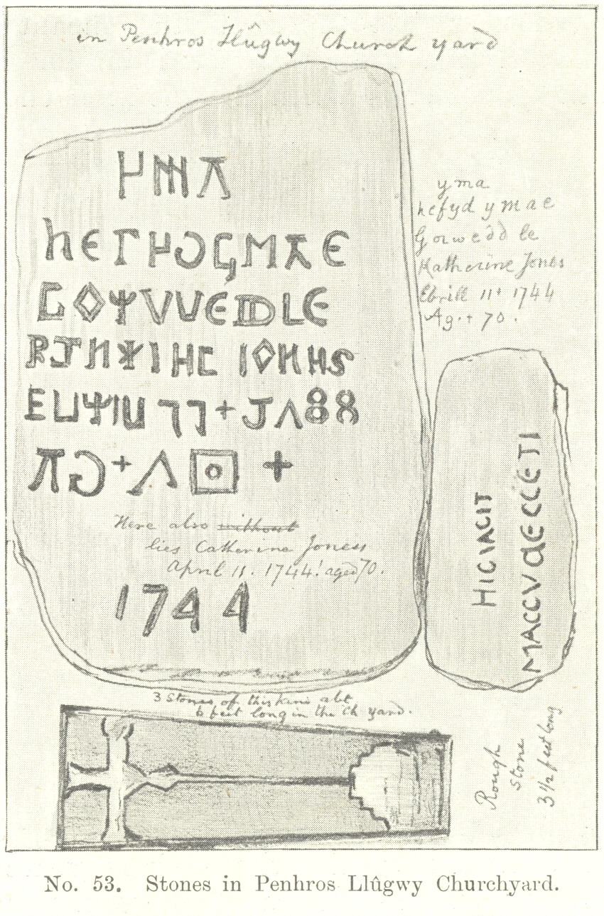 I should rather conceive that the metal was brass but whatever it was it would have been of more considerable value in the eyes of the antiquarian. Not far from this place he pointed to a number of loose stones called by a Welsh word answering to gold tongues [75a] as many pieces of gold of that shape he said were formerly picked up here. From the formation here specified I think one may not hesitate a moment in pronouncing they were brass celts or British weapons and as a farther (fol. 118a) confirmation of this opinion not a great way distant facing the south we traced the remains of a large British [75b] town. p. 76Here about forty or fifty foundations such as we have before noticed at Tre Evan may be clearly discerned some lying in a cluster together others standing separate, others again having a square form the name given to these remains scattered over the island we were informed by our intelligent companion by Cyteau [76a] Gwydellhod not Irishmens huts as some have translated it but the houses of the wild inhabitants. A spring rising near the spot still has a term of the same signification being stiled the well of the wild inhabitants. Some vestiges of similar [76b] buildings are to be traced to the north side of the hill, as also on the rising ground facing that part of Bodafon we have just noticed. It is natural to suppose that when the island was covered with wood, the inhabitants would fix their residence on elevated stations as a security (fol. 120) against their enemies and beasts of prey we may suppose the lower parts of these huts were alone built of stone and that branches of trees and earth formed the covering like those at present used amongst the lowest orders of Irish peasantry and why may not this people have retained the mode observed by the ancient Britons from whence they derive their origin. The highest point of Bodafon hills lies to the east commanding almost the whole circuit of the island. Here a beacon used to be lighted in case of invasion or to convey signals to the opposite coast of Carnarvonshire although probably it is many years since anything of the kind was used, yet the stones and the earth bear evident marks of the fire. It blew so hard to-day that it was with difficulty we kept on our legs on the high ground but on descending we were sheltered from the wind and had a pleasant walk to Penhros Llûgwy church an ancient building about half a mile to the south east of Bodafon hills. On a (fol. 120a) rough flat stone in the church yard I traced p. 77the following inscription, hic jacet Macuceceti. [77a] Mr. Rowlands, upon what authority I know not, supposes this to have been an inscription on Mechell or Macutius bishop of St. Maloes in Little Britain, who he says was buried here. We also observed two or three flat grave [77b] stones of a rough gritty substance about six feet long whereon was cut the figure of a cross in the same manner as those I noticed last year at Furness abbey. But what seemed most curious at p. 78first sight was an inscription marked on a flat stone [78] lying on the ground whose characters I recognised to be similar to what I had observed on the font at Bridekirk in Cumberland mixed with Saxon letters of a much later date. On observing Mr. Richards smile after I had finished my copy I requested he would candidly tell me what the inscription meant and in what character (fol. 122) it was written for I could make nothing out of it when he was kind enough to relieve me from my perplexity by explaining that it had been executed within these sixty years by a shepherds boy at the desire of a gentleman who employed various alphabets to compose it. The words are Welsh to this effect Yma hefyd mae Gorwedd Katherine Jones Ebrill 11 1744. ag. 70. Here also lies without Catherine Jones April 11 1744 aged 70. This I suppose was intended as a stumbling block for p. 79antiquarians the idea being probably suggested by Mr. Rowland’s Macutius in the neighbourhood. Like Doctor Johnson at the Hebrides I here had to regret the loss of my walking stick for although I dispatched our attendant and clerk in quest of it before we had proceeded an hundred yards from the place where I had copied the inscription, it was vanished. I shrewdly suspect that the clerk had taken a fancy to it as there was no other person in the church yard excepting our own party. However as he supplied me with something as a substitute it (fol. 122a) did not longer delay our march which brought us in the course of half an hour to Llûgwy house an ancient mansion now rented by a farmer under Lord Boston who goodnaturedly invited us within doors and refreshed us with a good luncheon of bread and cheese and some excellent ale. We then walked a short distance from the house to a rising ground overgrown with timber trees and coppice wood but still there was sufficient opening to enable us to trace a number of the Cytiau Gwyddellhod of a more perfect form and larger dimensions than any we had yet seen. They appear to be surrounded by a breast work of massive stones stuck edgeways in the ground evidently intended as a fortification which was probably strengthened by a mound and sharp stakes. The habitations here are very contiguous the entrances easily traced as also a communication [79] from one to the other. This is a strong confirmation of the historical account of the Aborigines who are said in the different tribes to have had every (fol. 126) thing in common.