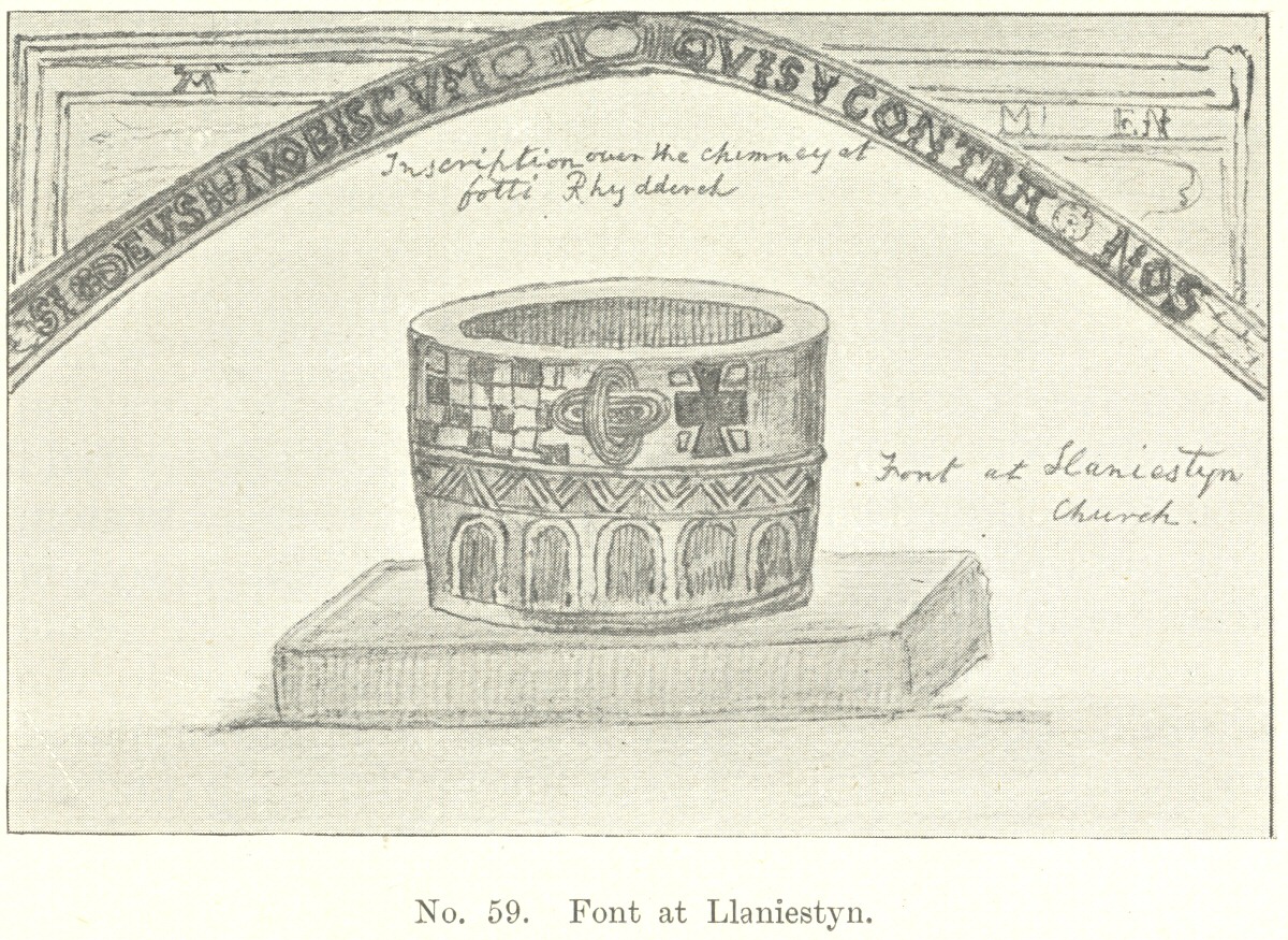 We were not sorry to leave this wretched alehouse as soon as there was sufficient light to see our direction three miles across the sands of Traeth Gôch to the village of Llanddona whose church stands on an eminence above the (fol. 130) bay and was first founded by Ddona grandson of Brychfael ys Cythrog (who fought the Saxons when the monks of Bangor Iscoed were slaughtered) anno six hundred and ten. About half a mile to the left are the traces of a large entrenchment supposed to have been thrown up by the Britons as a defence against the northern invaders. This is on a p. 84rising knoll called Dyn Sylwyn [84a] or Round Table Hill. This we had not leisure to see being obliged to hasten to Llainestan [84b] about a mile in the contrary direction in order to have sufficient time to notice an ancient monument, mentioned by Mr. Rowlands, before service began. Fortunately the church door was open and we met with no interruption during the half hour we stayed there. The object in question covering a cenotaph rose about two feet above the pavement near the communion table. A person in a sacerdotal habit p. 85holding a pastoral crook in his right hand and in his left a scroll is here represented, whereon is inscribed (fol. 131a) hic jacet sanctus Jestinus cui &c., round the border of the slab towards the head the characters in parts are much defaced but I read Gryffydd ap Gwyllym in oblationem istam imaginem pro salute animarum suarum. The style of workmanship appears very similar to that of Pabo post Prid and by the way tends to confirm the opinion we there formed that the sculpture is many centuries posterior to the time of the persons they are designed to represent and offered as an oblation to the church for the purpose of securing the favour and mediation of the patron saint. That the family of this Gryffyd ap Gwyllym resided in this neighbourhood appears from a document still extant dated at Rhayder Gadog June the twentieth in the twenty seventh year of Henry the sixth by which seven villaines or vassals were made over and granted by Ednyfed Fychan ap Ednyfed Dafydd ap Gryffydd and Howell ap Dafydd according to the feudal system still obtaining to (fol. 133) William Gryffyd ap Gwylym free tenant of Porthamel probably the very same person who presented the effigies of St. Jesten to the church. This Jesten founder of the church is supposed to have been the son of Gerennius or Geraint grandson of Constantine duke of Cornwall successor to king Arthur. The font is certainly very ancient probably coeval with the original building. The present structure differs nothing from other Welsh Churches. From hence proceeded across a swampy heath for a mile and a half to an old mansion called Fotti [85] Rhydderch or Roderick’s summer house having been directed thither to see an inscription cut over an arched chimney piece in the kitchen. The characters appear to be about the time of Henry the eighth or his successor and are read Si deus nobiscum quis contra nos. This place formerly the residence of a gentleman’s family like p. 86most others we have had occasion to notice in the island is now tenanted by a farmer (fol. 133a) who has a fine family of nine children. The eldest a lad of only eleven years old engaged to conduct us to the cromlechs at Cremlyn and Trefor. At the former place there is little worthy of notice but at the latter I took two sketches of a very perfect cromlech the upper stone measuring about three yards across supported by two uprights the larger six feet high the other not above four and a half which cause the cap stone to recline in a slanting direction. Another long stone now lying on the ground appears to have been formerly used as a supporter. Near at hand also are three or four flat stones lying promiscuously.
