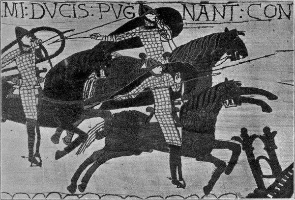 Fig. 2.—Norman knights in mail hauberks and conical helmets. From the Bayeux Tapestry.