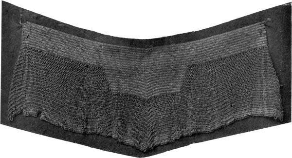 The Scandinavian also, isolated so long and unknown in history, suddenly burst upon Europe as a new and even more redoubtable mail-clad warrior. How so remote a people became acquainted with chain-mail can only be surmised, but it was perhaps through some Scythian channel not open to Western Europe. That the ravaging Viking landed on our shores equipped in mail, the “war nets” of Beowulf, “woven by the smiths, hand-locked, and riveted”; “shining over the waters” or in “the ranks of battle,” is sufficiently recorded by the Chroniclers. Shirts of mail, called “byrnies,” attributed to even the fourth and fifth centuries, are found in Danish peat-bogs fashioned of rings welded and riveted in alternate rows as neatly and skilfully as can possibly be, and all made by the hammer, if it be a fact that wire-drawing was not invented till nearly a thousand years later. The almost perfect specimen we figure, one-tenth the natural size, was found at Vimose, with portions of others. Some[Pg 10] have also been found at Thorsberg, and in a burial-place of Roman age in Jutland.