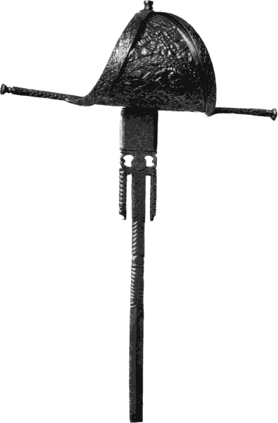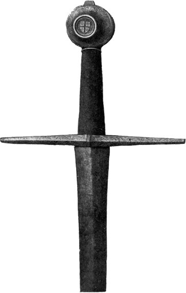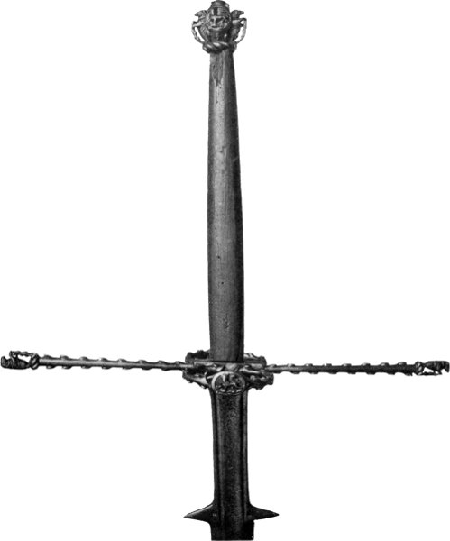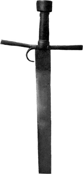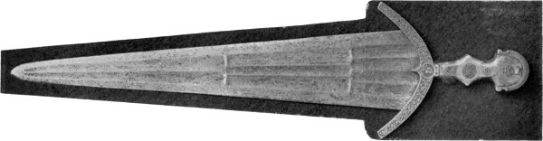 Besides the mail defence, the Danes were armed with a shield, an iron cap, lance, axe, and sword. Thus equipped they proved for a long time almost irresistible, and ventured on the most dangerous and desperate undertakings. When we reflect on their adventurous voyages, the reckless attacks on powerful nations made by mere handfuls of men, and the gallant pertinacity they at all times displayed, it is impossible not to admire their exalted courage. It is easy to detect a rugged poetry, almost chivalry of a kind, underlying the Viking nature, in spite of ruthless cruelty, while the exaltation of deceit when practised on an enemy into a virtue is but a germ of modern statecraft. Their lives depending at every moment on the quality of their weapons caused these to be invested, particularly the sword, with a mystic glamour, which scarcely died out with chivalry itself, and lingers even yet in the more important functions of state. The chieftain’s sword was in fact his inseparable companion, known and endeared to his followers by a name symbolic of the havoc they had seen it wreak upon the enemy, and its fame in sagas was as undying as its owner’s. Tradition elevated the maker of the sword of Odin, a smith, we must believe, who forged swords of uncommon excellence, into a demigod; and has handed down the story of how he made a blade called Mimung so keenly tempered that when challenged to try conclusions with one Amilias, a rival, it sliced him so cleanly in two as he sat in his armour, that the cut only became apparent when, as he rose to shake himself, he fell dead in two halves. The name of this prince of craftsmen yet lives in the mysterious Wayland Smith of English folklore. Another vaunting smith Mimer was slain by the sword Grauer wielded by Sigurd; and the sword Hrunting is made famous by its owner Beowulf, the father of English lyrics. A Danish sword in the British Museum is inscribed in runes Ægenkœra, the awe-inspirer. From the Danes the exaltation of the sword passed to the English, and we find Ethelwulf, Alfred, and Athelstan bequeathing their swords by will as most precious possessions, equivalent to a brother’s or sister’s portion. Thence it passed, in legend at least, to the Britons, King Arthur’s sword Calibon, or Excalibur, presented ultimately by Richard I. to Tancred when in Sicily, being almost as famous as Arthur himself.[Pg 11] Even Cæsar is provided by history with a sword named “Crocea mors,” captured from him in combat by our valiant countryman Nennius. The hilts of the Danish swords are described in the Edda as of gold, and Beowulf speaks of hilts that were treasures of gold and jewels. Canute’s huiscarles and Earl Godwin’s crew had swords inlaid with the precious metals, and some English swords were valued at eighty mancuses of gold.