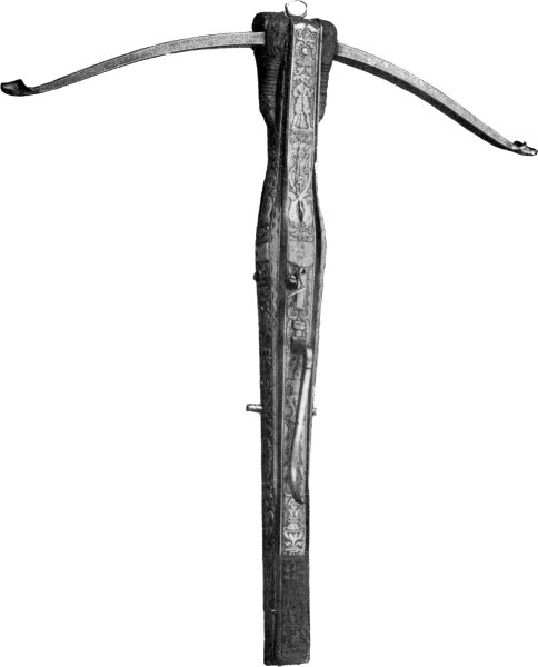 The cross-bow was an even more powerful weapon, whose use had been forbidden in war, but allowed by the Pope to the Crusaders in 1139. Richard I. appears to have introduced it into the English army, which became so expert in its use that in some of the sieges conducted during the twelfth and thirteenth centuries the enemies’ walls could not be manned. It is related of Richard, both at the sieges of Acre and Nottingham, that he himself slew men with this weapon. The numbers of cross-bowmen[Pg 15] in our armies appear, however, to have been always relatively small. King John, with 400 knights, had but 250 cross-bowmen, used as skirmishers, keeping a mile in front of the army. The splendid army of Edward I. assembled at Poitou (1242), numbering 1600 knights and 20,000 foot, comprised but 700. The battle of Lincoln, however, was gained by them owing to their shot mowing down the horses of the barons, who were rendered helpless when dismounted. The cross-bow was at first bent by the hand and foot, but was afterwards of steel, when it required mechanical aids to charge it. The short and heavy bolts, called quarrels, struck with greater force than arrows, and the knight hit full on the head or breast by one was fortunate if only stunned. Instances are recorded of twofold mail and the quilted coat being penetrated by them. Cross-bowmen for a long time formed corps d’élite, the weight of the weapon and the armour causing them to be frequently mounted, and so early as King John the mounted “balistarii” were provided with one, two, or even three horses each, with carts to carry the quarrels and even the cross-bows as well. Notwithstanding superior accuracy in aim and penetrating power, it fell into disuse in England soon after the close of the thirteenth century, owing to its heavy weight and liability to damage by wet, and above all, on account of the greater rapidity with which arrows could be discharged from the longbow,—in a ratio of something like ten to one.