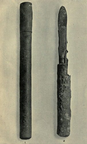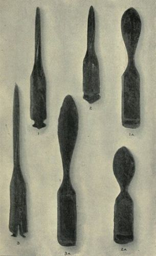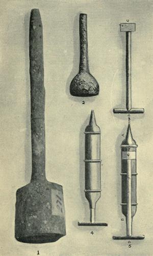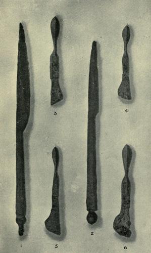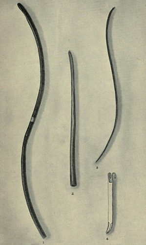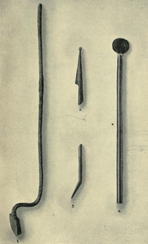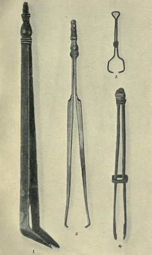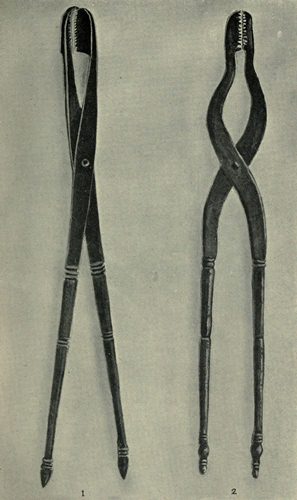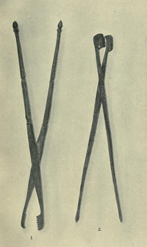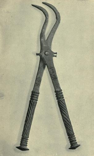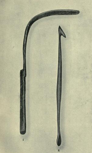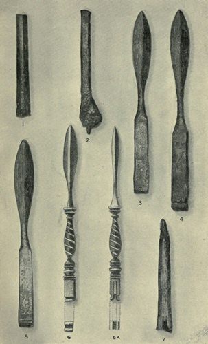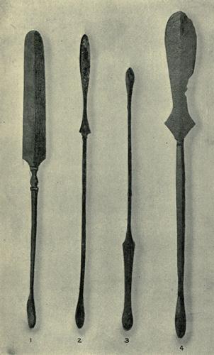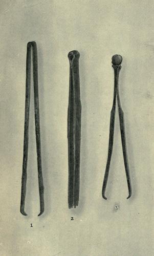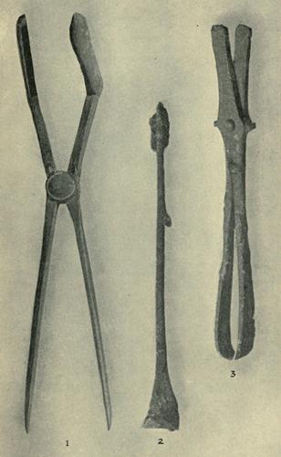 This is the earliest reference to tempering steel by the Greeks with which I am acquainted. It is a curious commentary on the relative destruction of iron instruments compared with those of bronze, that cauteries, which are always described as made of iron and which must have existed in enormous numbers, are among the rarest surgical instruments found. We have a few cauteries of iron, however, and some knives and knife-blades and other instruments remain. Pots for ointments of certain kinds were made of iron, and we have actually two of these which had been the property of a Roman oculist whose full name is known. I have entered into this discussion because there seems to be a general tendency to underestimate the extent to which iron was employed by the Greeks and Romans. The quantity of scoria left by the primitive founders should alone be sufficient to teach us to how great an extent iron was in use. Wherever there was good iron in any of the Roman provinces, veritable mountains of scoria are found. The heaps of scoria left in the Forest of Dean by the Roman founders contained such a large percentage of iron still remaining that they were smelted over again in later times, and to do this occupied over twenty furnaces for a couple of centuries. Tolouse calculated that similar heaps in Gaul contained over 120,000 tons of scoria. If, however, we tend to underestimate the extent to which iron was in use among the Greeks and Romans, still more, I believe, do we tend to underrate the quantity and the quality of the steel available in those times. This comes about from the fact that in our day we require such enormous quantities of iron and steel that we have to employ iron[Pg 12] ores of a very low quality. The greater part of the so-called steel of which battleships are made is got from a ferruginous mud with only 30 per cent. of iron, less than there was left in the scoria after the Roman founder had done with it. To the impurities already existing in this we add others, because the coal we use contains sulphur. It is getting rid of these impurities that makes the production of steel such a roundabout process with us. We forget that, with primitive methods but fine ores and a fuel devoid of sulphur, the production of steel of fine quality is as easy a process as the manufacture of iron, in fact the only difference between the method of procuring iron and steel under these circumstances is the length of time the process is allowed to go on. The ancient founders used the finest ores, often containing 75 per cent. of iron, and, working with charcoal fuel, which was nearly pure carbon, they could produce steel as easily as iron. The difference between steel and iron is that steel contains carbon, and, by allowing the ore to remain longer in contact with the charcoal, steel is formed, so that a founder setting out to make iron with a pure ore and a pure fuel like charcoal, may, if he is not careful, turn out steel of fine quality. This primitive method of making steel is still in vogue in India, Burma, Borneo, China, &c., and very fine qualities of steel are produced. The majority of the tools found in the earliest Greek colonies on the Nile—Naukratis and Daphnae—are of steel or iron, although those of the Egyptians among whom they were living (circa 600 B. C.) were of bronze. The classical medical writings themselves are sufficient evidence of the quality of the steel available in those times. Galen (ii. 683) says that the best quality of steel (which came from Norica) yielded a knife which neither blunted easily nor bent or chipped.