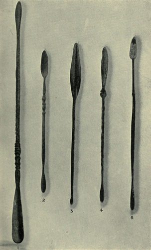 | Specilla or probe-like instruments—Definition of specillum—κοπάριον—μήλη—ὑπάλειπτρον—Materials—Bronze—Silver—Gold—Tin—Wood—Bristle—Flower-stalk—Specillum as sound—Combination of instruments on one shaft—Plain rods—Double olive—Spathomele or spatula-probe—Cyathiscomele or spoon-probe—Ear specillum—Probe with screw thread—Specillum vulnerarium—Handled needle—Ophthalmic probe—Rasping specillum—Trachoma curette (Blepharoxyston)—Styli and styloid specilla—Grooved director—Surgical needle—Dressing needle—Bodkin—Eyed probes—Ligula—Spoons for warming and pouring salves—Tongue depressor—Uterine sounds—Uterine dilators—Bifurcated probe—Y probe—Blunt dissector—Curved dissectors—Sharp hooks—Blunt hooks—Aneurism needle—Strigil—Spoon for applying liquid to uvula. | |