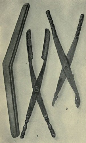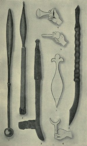 This shows that the Greek surgeon appreciated good steel, and what I have said will show that there was plenty of it[Pg 13] to be had. Yet modern writers almost invariably speak of or describe even the cutting instruments of the ancients as made of iron. Greek and Latin have each only one word to indicate both steel and iron, but that is because, as I have shown, they prepared both in the same way. The ancient Hindoo Vedas say that cutting instruments were to be made of steel, well polished and sufficiently keen to divide a hair. For sharpening, a stone was to be used, and they were to be kept clean and wrapt in flannel and laid by in a box of sandalwood. Albucasis in mentioning steel always specifies Indian steel. Many of the Roman shears of steel retain their spring perfectly. As an illustration of the keenness of edge which can be put by simple methods upon steel of primitive manufacture, take the following account of the operations of an African barber of the Hausa tribe, as reported in an account by Professor R. W. Reid, Aberdeen, of a Hausa barber-doctor’s outfit presented to the Anthropological Museum of the University by Sir William MacGregor, Governor of Lagos. The description of the outfit is quoted from Sir William MacGregor, who says: