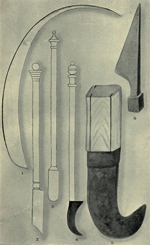 | Raspatory—Chisel—Gouge—Lenticular—Hammer—Block—Meningophylax—Drill—Drill with guard (Abaptista)—Saw—Trephine—Perforator for fistula lachrymalis—Bone elevator—Sequestrum forceps—Varix extractor—Blacksmith’s tongs—Tooth forceps—stump forceps—Tooth elevator—Tooth scalers—File—Forceps for extracting weapons—Periosteal elevator for the pericranium—Impellent—Arrow scoop. | |