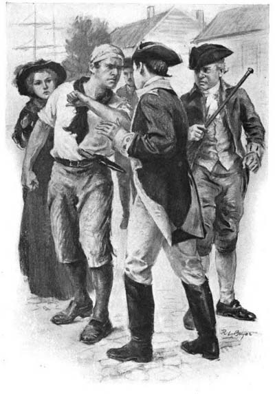 “Spy!” Men and women sprang to their feet; swords were drawn, chairs were overturned. With a swift look over his shoulder George saw Peggy’s face whiten; then like a panther he sprang upon Hyde. Down went the man as though stricken by a thunderbolt; over his body leaped the young New Englander. As he did so the outer door was flung open and the fat sergeant bounced into the inn.