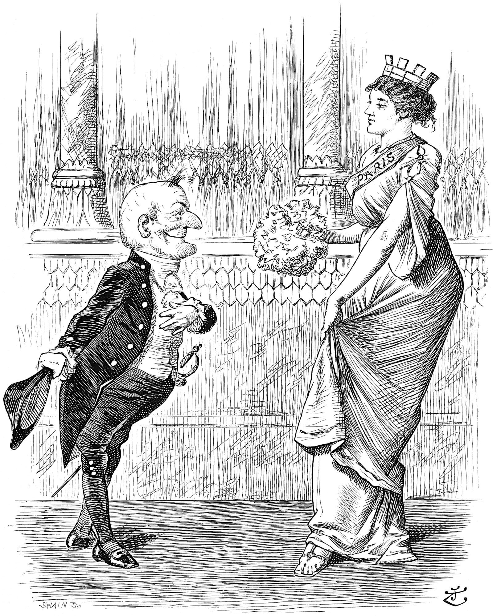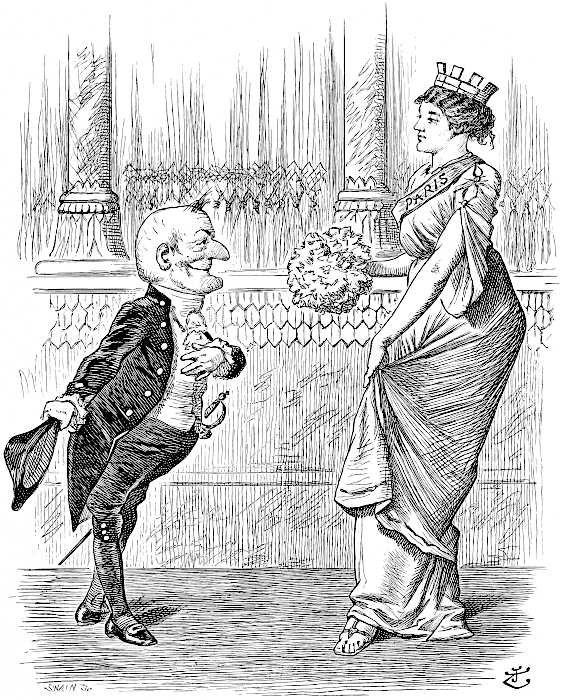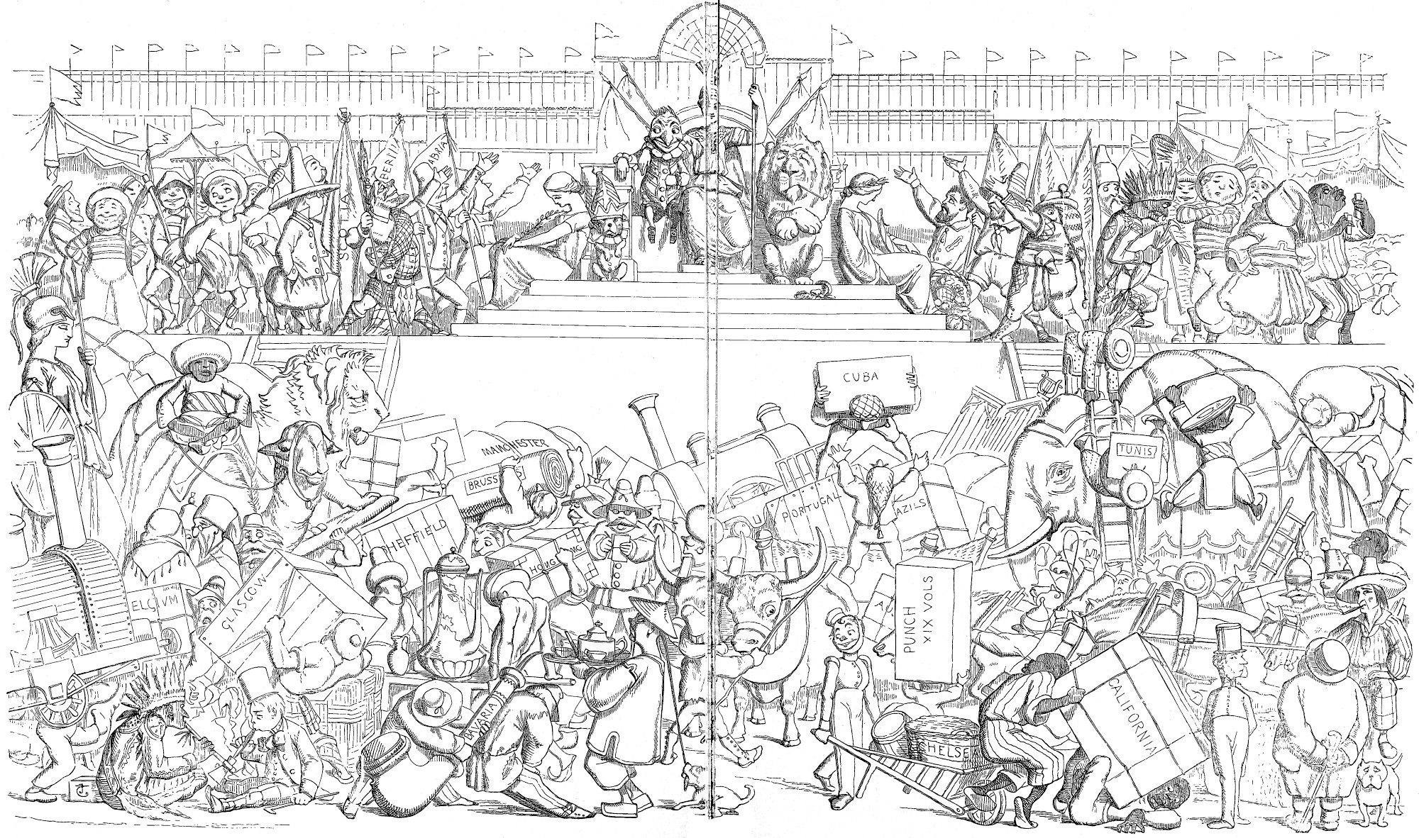 | “Mr. Punch” here expresses his good wishes for the success of the Paris Exhibition, which was shortly to be opened. | |