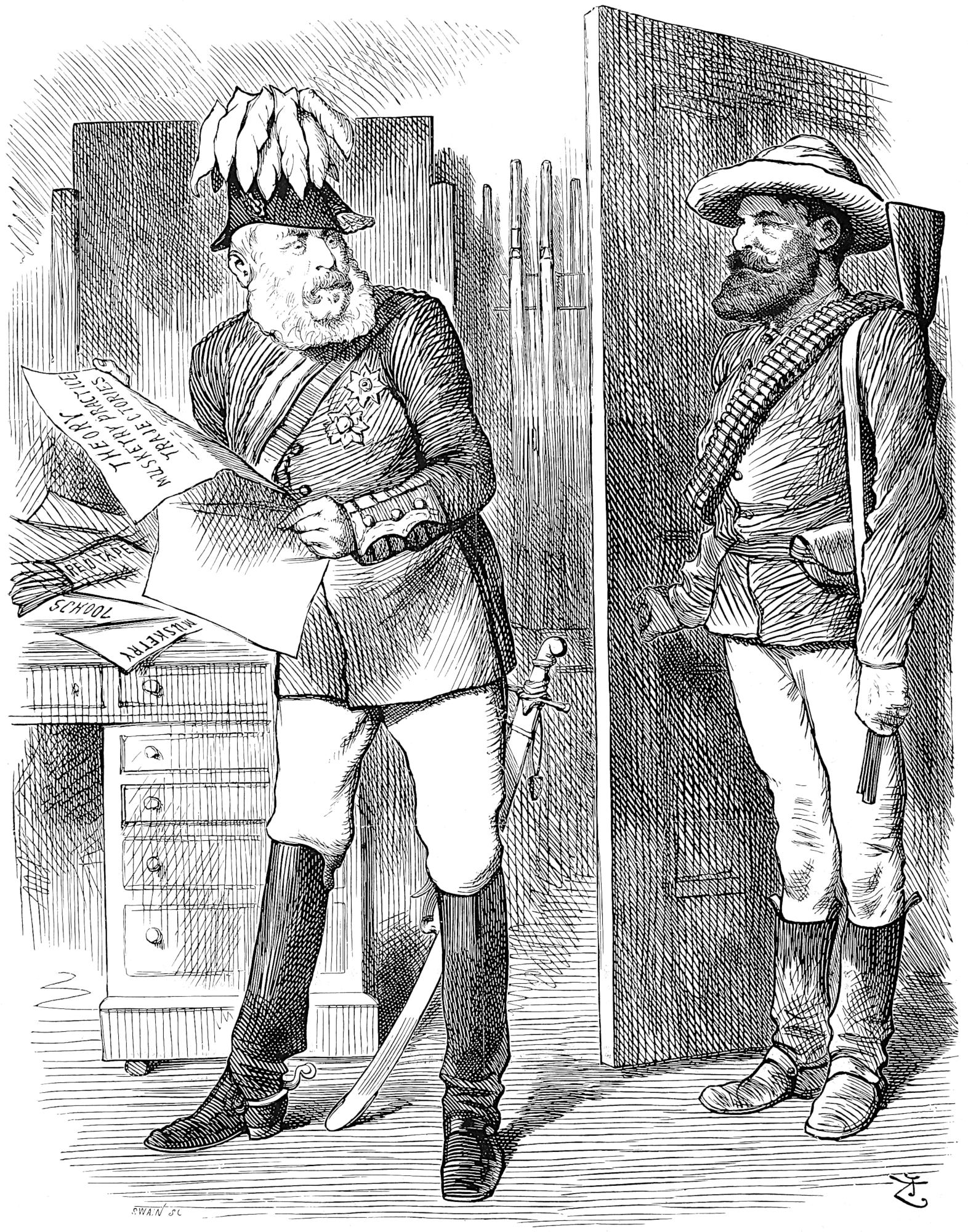 | At the battle of Majuba Hill the Boers had shown their superiority in marksmanship. “Mr. Punch” points the lesson for the benefit of the Duke of Cambridge. | |