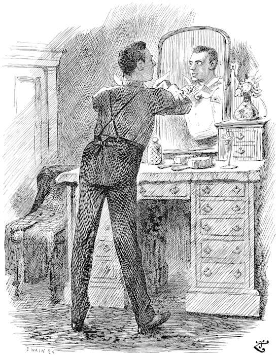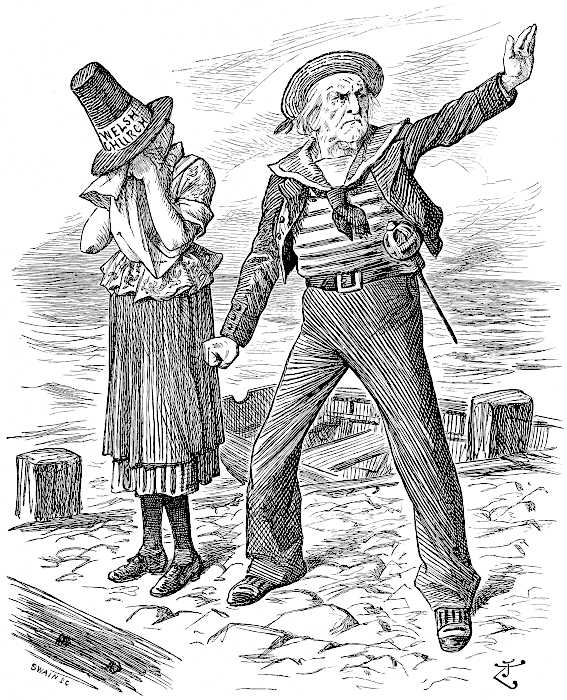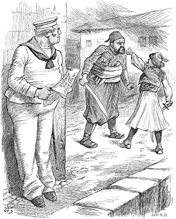 Open-minded William (having come ashore from “The Stormy Petrel”). “Avast there, Messmates! The statesman who would lay his hands on a steeple-hatted female in distress—save in the way of ke-indness,” etc., etc.