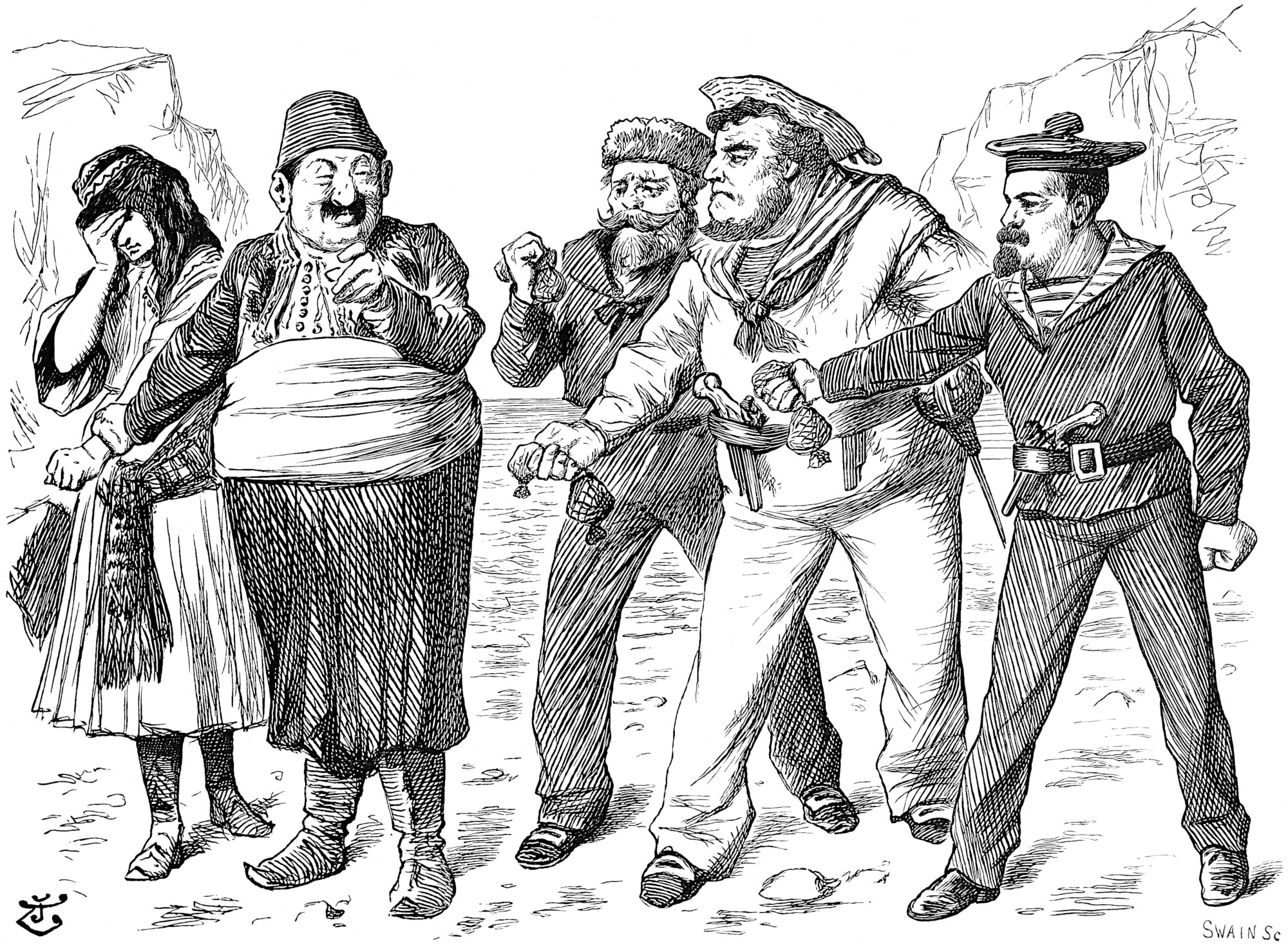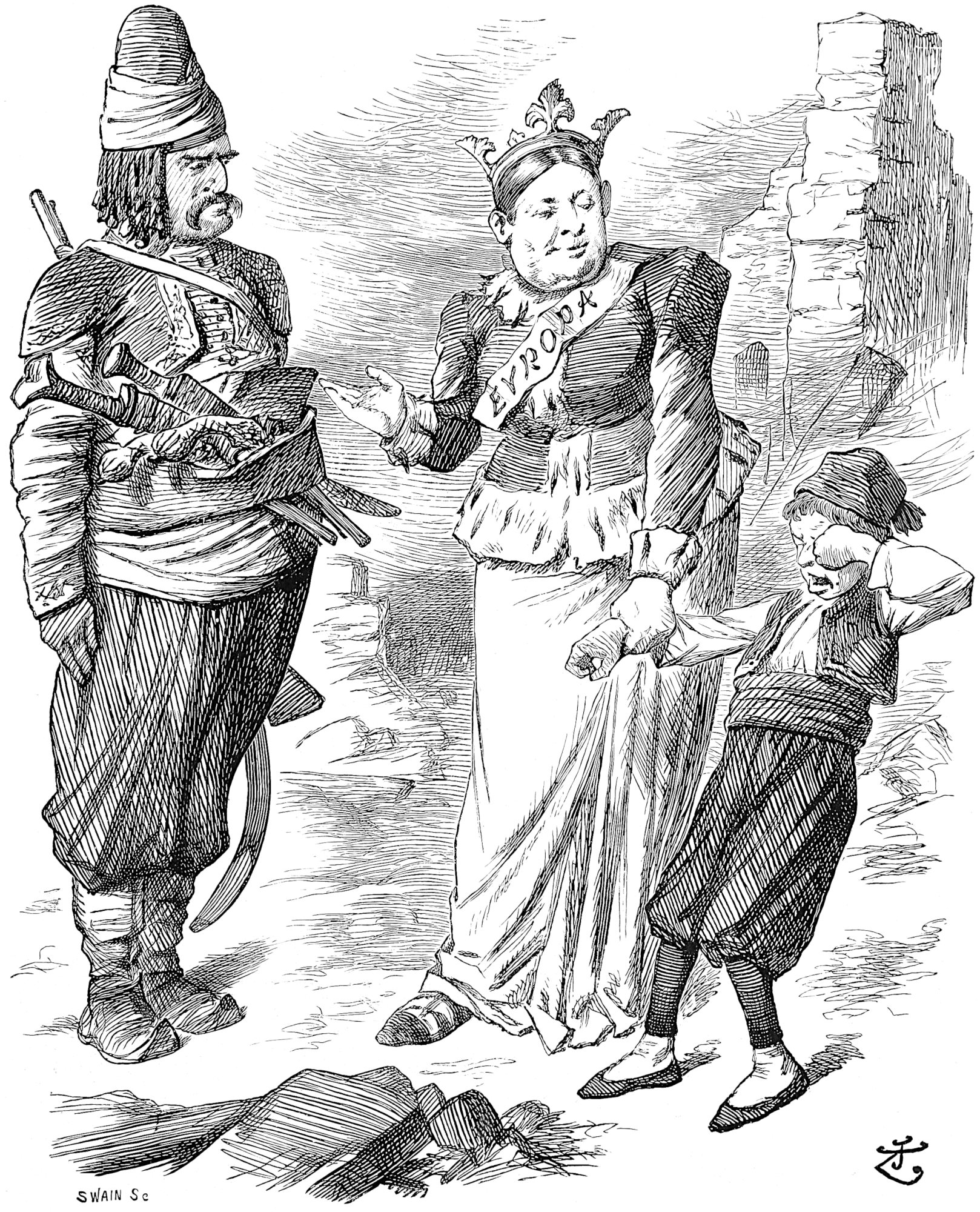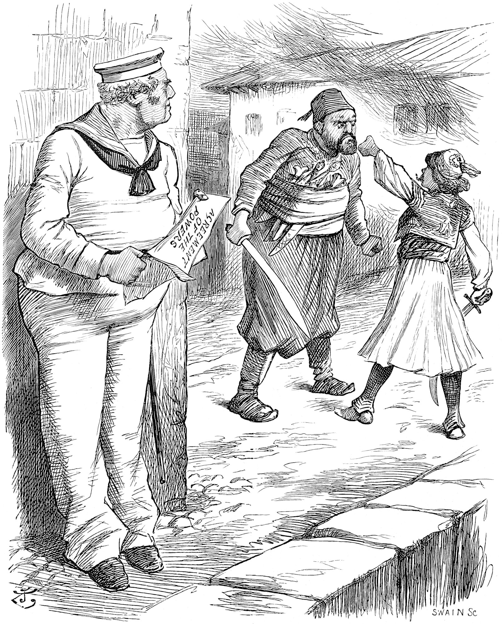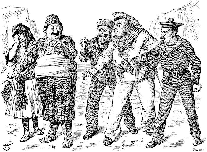 Dame Europa (to Little Crete). “Don’t cry, my little Man. I’ve asked this nice, kind Turkish Policeman to stay and take care of you!”