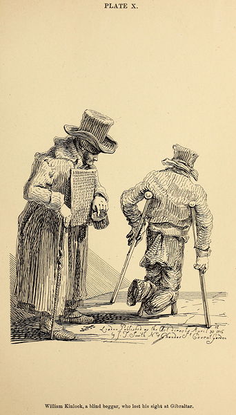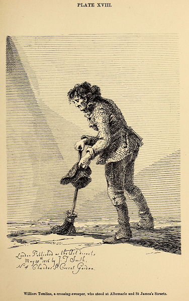 Street-crossing sweepers next make their appearance; the first on the list being William Tomlins, whose stand is very productive, as it includes both Albemarle and St James Streets. Of this man there is nothing further remarkable, beyond his attention to his pitch, for so the beggars and ballad-singers call their stands. He appears to be alive to the receipt of every penny, and will not suffer himself by any means to be diverted from his solicitations; as a strong proof of which, he refused to hold the horse of a gentleman who called to him for that purpose, and from this it may be inferred that he thought begging a better occupation.