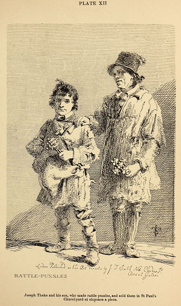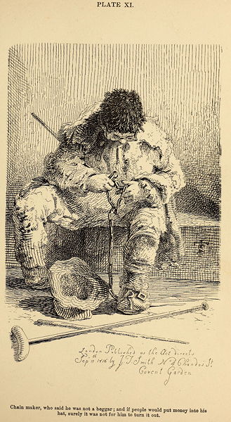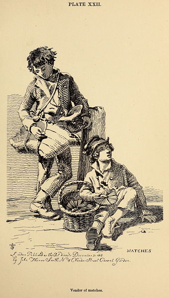 Of Scottish, Welsh, and Irish mendicants there are now very few in London; perhaps their full number does not exceed fifty, unless by including that lower order of street-musicians who so frequently distract the harmonious ear with their droning bag-pipes, screaming clarionets, and crazy harps. These people, with match, tooth-pick, and cotton-ball venders, may be considered but as one remove from beggary.
