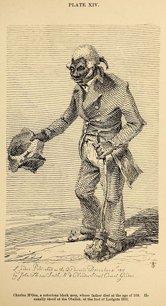 The back view of the person exhibited in the following plate, is that of Samuel Horsey, who, in December 1816, had been a London beggar for thirty-one years. Of this man there are various opinions, and it is much to be doubted if the truth can be obtained even from his own mouth. He states that Mr Abernethy cut off his legs in St Bartholomew's Hospital, but he does not declare from what cause; so that being deprived of the power of gaining a subsistence by labour, he was forced to become a beggar. By {22} some persons he is styled the King of the Beggars, but certainly without the least foundation. He says that no one has been less acquainted with beggars than himself; and as for his having the command of a district, that he utterly denies. His walks, or rather movements, are not always confined; on some days he slides to Charing Cross, but is oftener to be seen at the door of Mr Coutts's banking-house, perhaps with an idea that persons just after they have received money are more likely to bestow charity.