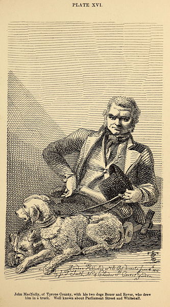 John MacNally, of Tyrone County, with his two dogs Boxer and Rover, who drew him in a truck. Well known about Parliament Street and Whitehall.