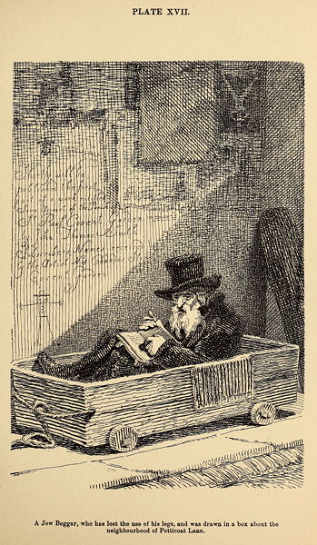 The figure in the box is that of a Jew mendicant, who has unfortunately lost the use of his legs, and is placed every morning in the above vehicle, so that he may be drawn about the neighbourhood of Petticoat Lane, and exhibited as an object of charity. His venerable appearance renders it impossible for a Jew or a Christian to pass without giving him alms, though he never begs but of his own people; a custom highly creditable to the Jews, and even more attentively observed by that truly honourable Society of Friends, vulgarly called Quakers, who neither suffer their poor to beg, nor become burthensome to any but themselves.