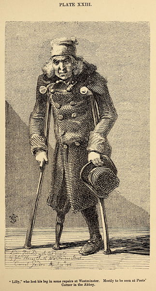 The subjects of the next two plates are unfortunate mendicants. The first is a silver-haired man, of the name of Lilly, who lost his leg in some repairs at Westminster. Poets' Corner, in the Abbey, is the place where he is mostly to be seen.