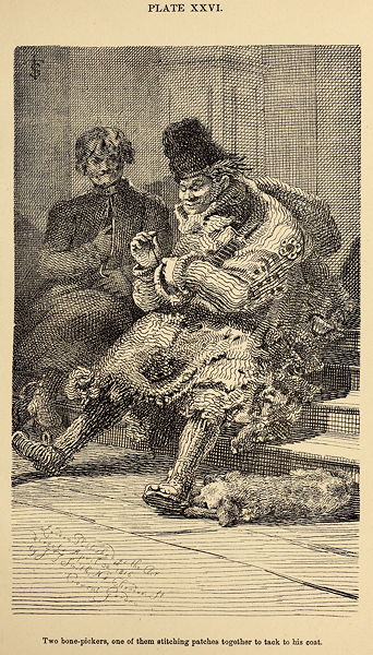 Two bone-pickers, one of them stitching patches together to tack to his coat.
