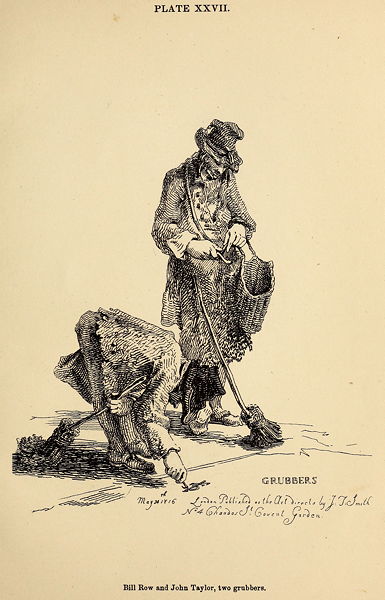 Bill Row and John Taylor, two grubbers, are introduced in the next plate. These men, with Stephen Lloyd, form the sum total of their description in London. They procure a livelihood by whatever they find in grubbing out the dirt from between the stones with a crooked bit of iron, in search of nails that fall from horse-shoes, which are allowed to be the best iron that can be made use of for gun-barrels; and though the streets are constantly looked over at the dawn of day by a set of men in search of sticks, handkerchiefs, shawls, &c., that may have been dropped during the night, yet these grubbers now and then find rings that have been drawn off with the gloves, or small money that has been washed by the showers between the stones. These men are frequently employed to clear gully-holes and common sewers, the stench of which is so great that their breath becomes pestilential; and its noxious quality on one occasion had so powerful an effect on a man of the name of Dixie, as to deprive him of two of his senses, smelling and tasting, and yet Ned Flowers followed this calling for forty years.
