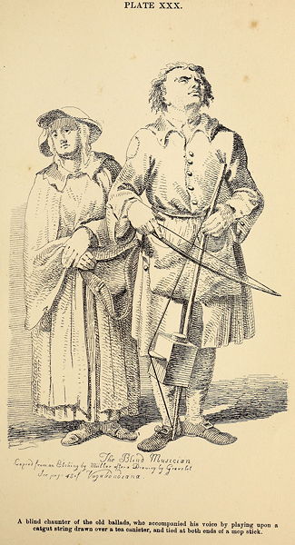 A blind chaunter of the old ballads, who accompanied his voice by playing upon a catgut string drawn over a tea canister, and tied at both ends of a mop stick.