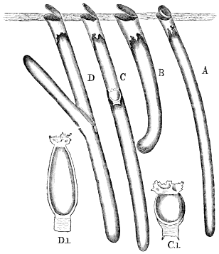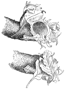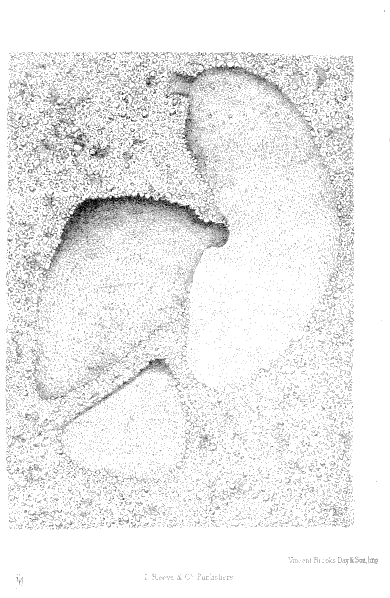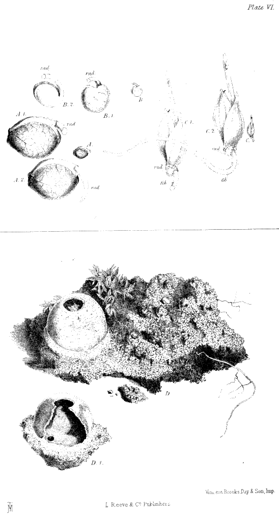 Plate VI., p. 35, fig. A.—A sprouting hemp-seed, part of the radicle of which has been gnawed by the ants, of the natural size; A 1, the same, magnified, rad. radicle; A 2, an entire sprouting seed of the same, magnified; B, a sprouting pea, part of the radicle of which has been gnawed off; B 1, the same, magnified; B 2, the same stripped of its [ x ] coat, and showing the two seed leaves; C, a sprouting "canary-seed" (the grain of Phalaris canariensis), part of the fibril of which has been gnawed off; C 1, the same, magnified, rad. the radicle which remains undeveloped, and fib. the fibril or first rootlet; C 2, an unmutilated sprouting "canary seed;" D, a mass of earth taken out of the heart of a nest of Atta barbara, in which a spherical cell, made of hardened earth, was buried. It contained grass seeds, among which I found ants at work, and seeds of the same grass still in their husks lay in the gallery leading up to the entrance of this cell; D 1, the same, further freed from the earth, and having part of one side removed, so as to show the interior and the small lower opening leading out from the bottom of the cell.
