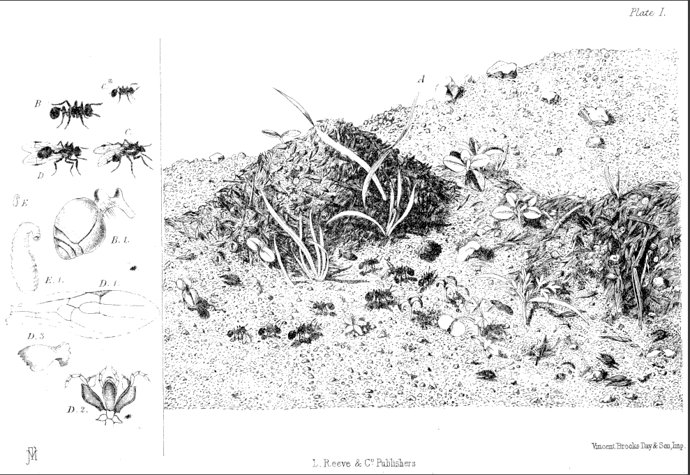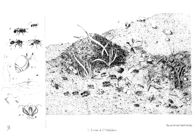 Plate I., p. 21, fig. A.—View of the entrance to a nest of Atta barbara, showing part of a train of ants bearing seeds, the conical mound of refuse thrown out, and some seedlings, which have sprung up from seeds accidentally dropped by the ants; B, one of the larger workers of this species, of the natural size, and B 1, its abdomen and pedicle, with two nodes, magnified; C*, one of the smaller workers, of the natural size; C, a male, of the natural size; D, a female, of the natural size; D 1, wing of the same, magnified; D 2, mouth organs of the same, magnified, with the mandibles removed, the two outer pieces being the maxillæ and their palpi, and the lozenge-shaped piece the labium, from the upper part of which the labial palpi spring, while behind the labium is the true tongue; D 3, one of the mandibles, magnified; E, a larva, of the natural size, and E 1, the same, magnified.