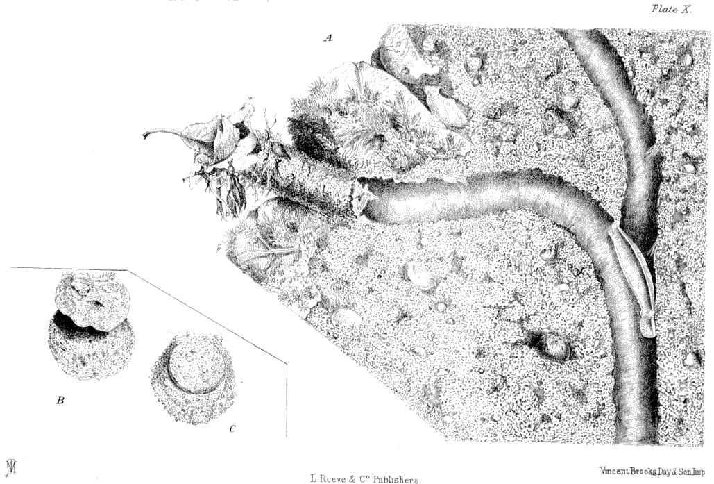 Plate X., p. 100, fig. A.—Part of a nest of N. meridionalis; B, the new and larger upper door of a nest of this spider, with the former and smaller upper door partially united to it; C, another example of enlargement in the upper door of the same spider, showing traces of two previous doors now incorporated. [All the figures are of the natural size.]