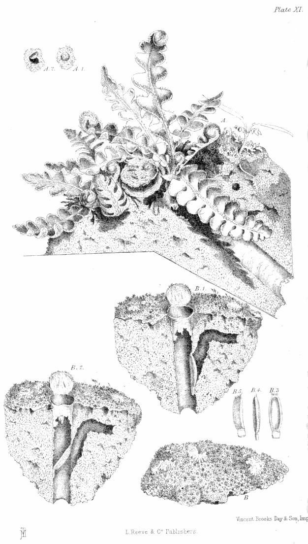 Plate XI., p. 105, fig. A.—The upper part of a nest of N. meridionalis concealed in a plant of Ceterach fern; A 1 and A 2, a minute cork-door, closed and open, which I saw constructed by a very young spider [either Cteniza fodiens, or, more probably, Nemesia cæmentaria] at the mouth of a hole in the mass of earth containing the nest of N. meridionalis figured at A. This hole may be seen on the right of the fern. B, the door of a small nest of N. meridionalis, as seen from above, in its natural position in a steeply sloping bank; B 1, part of the same nest placed in an upright position, and showing the surface door open and the lower door closing the branch; B 2, the same with the lower door pushed across so as to close the main tube; B 3, 4, and 5, different views of this second door. [All the figures in this plate are of the natural size.]