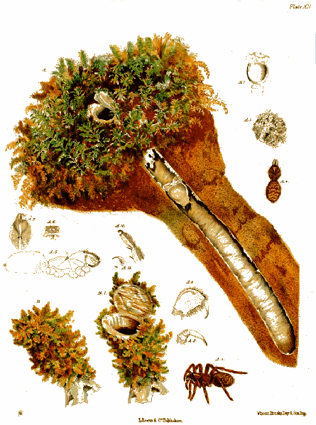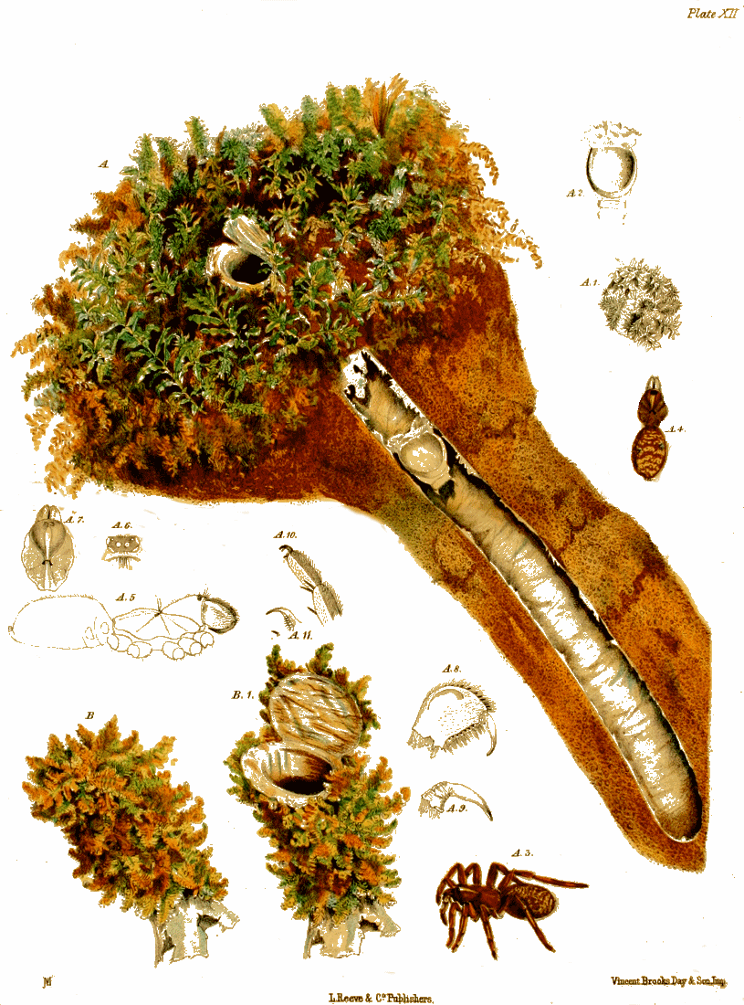 Plate XII., p. 106, fig. A.—The nest of N. Eleanora with the surface door artificially represented as being open; A 1, the outer side of the surface door of the same nest into which mosses of two kinds are woven; A 2, the second door of the same nest; A 3, the spider; A 4, the same deprived of its legs, from a specimen preserved in spirits [figs. A, A 1, 2, 3, and 4 are of the natural size]; fig. A 5, the spider viewed sideways, with the legs removed; A 6, the eyes viewed from above and in front; A 7, the cephalothorax and falces; A 8, the left-hand falx viewed from the inner side; A 9, the fang of the same; A 10, the tarsal joint of the foremost right leg; A 11, one of the two larger and the smallest claw of the same [figs. A 5, 6, 7, 8, 9, 10, and 11, magnified]; fig. B and B 1, the upper part of the tube and door of a nest of N. Eleanora which partially projected beyond the surface of the earth and was clothed with living moss. [Figs. B and B 1 are of the natural size.]