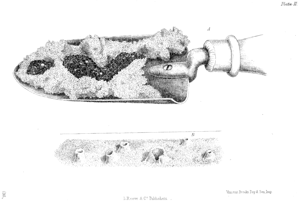 Plate II., p. 22, fig. A.—A trowel containing earth, in which a granary full of seeds is lying almost undisturbed, of the natural size; B, the crater-like entrances found at the mouths of the nests of Atta structor, reduced to one-half the natural size.