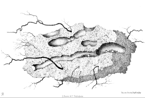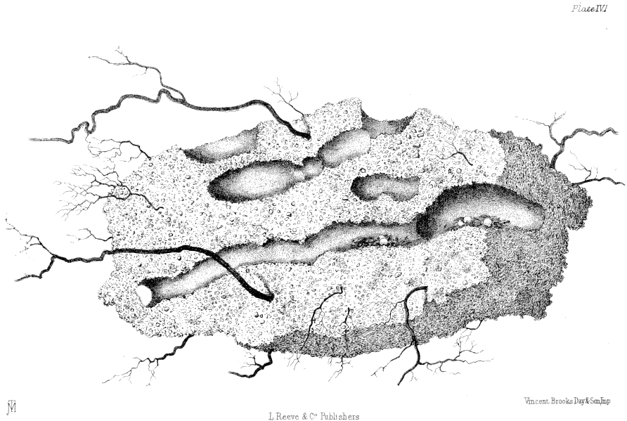 Plate IV., p. 31.—A mass of earth pierced by roots, in which the ants (Atta barbara) have made their granaries and galleries. The galleries were full of seeds when first laid open. Of the natural size.