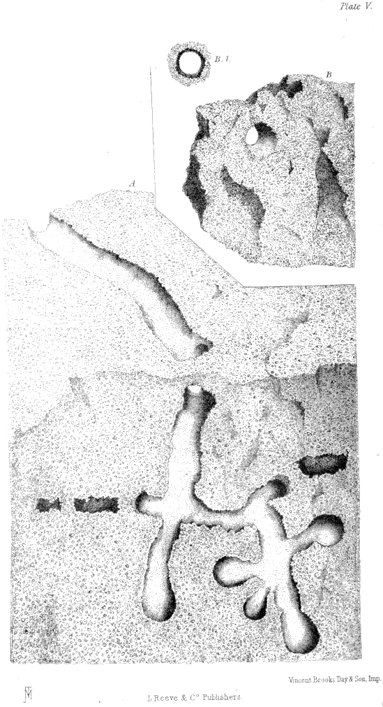 Plate V., p. 33, fig. A.—Galleries and terminal cells of a nest of Atta barbara, excavated in the living sandstone rock, drawn in situ, of the natural size; B, part of a cylindrical gallery from another rock-nest, and B 1, the same gallery seen in front, of the natural size.