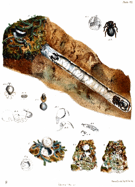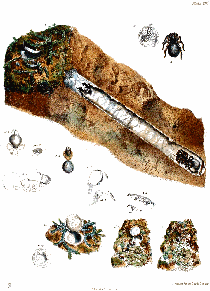 Plate VII., p. 88, fig. A.—The nest of Cteniza fodiens, the lower part of which is seen in section lying in the earth, the door is artificially represented as partly open; A 1, surface of the door viewed from above; A 2, the spider; A 3, the spider deprived of its legs, from a specimen preserved in spirits [figs. A, A 1, A 2, and A 3, are of the natural size]; A 4, the spider viewed sideways, with the legs removed; A 5, the eyes, viewed from above and in front; A 6, the cephalothorax and falces; A 7, the left hand falx, viewed from the inner side; A 8, the fang of the same; A 9, the tarsal joint of the foremost right leg; A 10, one of the two larger and the smallest claw of the same [figs. A 4, 5, 6, 7, 8, 9, and 10, all magnified]. Fig. B, the door of a nest of the same kind, concealed by lichens, below which, on the left hand, the doors of two minute nests of Nemesia meridionalis are seen; B 1, the same, with the doors open; C, the door and mouth of tube of a nest similar to that at A; C 1, the upper surface of this door, which is slightly convex.