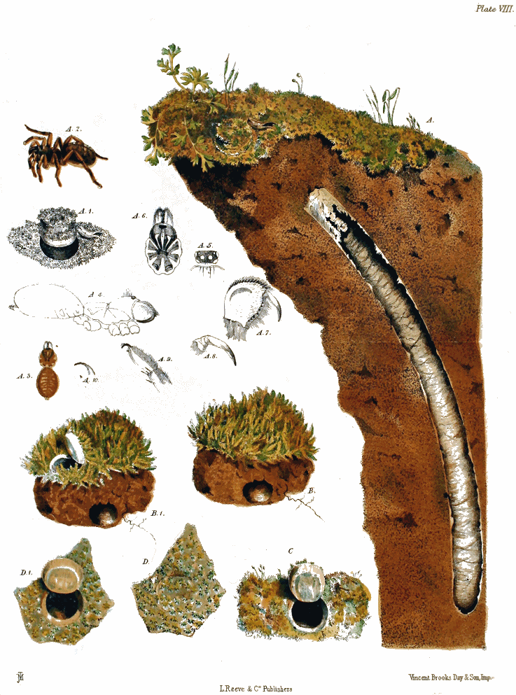 Plate VIII., p. 94, fig. A.—The nest of Nemesia cæmentaria; A 1, the door of the same, partially open; A 2, the spider; A 3, the same deprived of its legs, from a specimen preserved in spirits [figs. A, A 1, 2, and 3, of the natural size]; figs. A 4, 5, 6, 7, 8, 9, and 10 as in Plate VII., and magnified; B, a moss-covered lump of earth, in which the door of a nest of the same type as that at A lies concealed; B 1, the same, with the door open; C, the door and mouth of another similar nest, showing the claw marks on its under surface; D, the closed door of a third nest of the same kind; D 1, the same, opened.