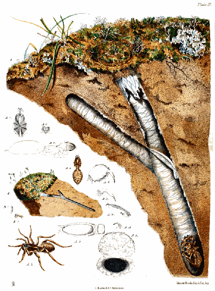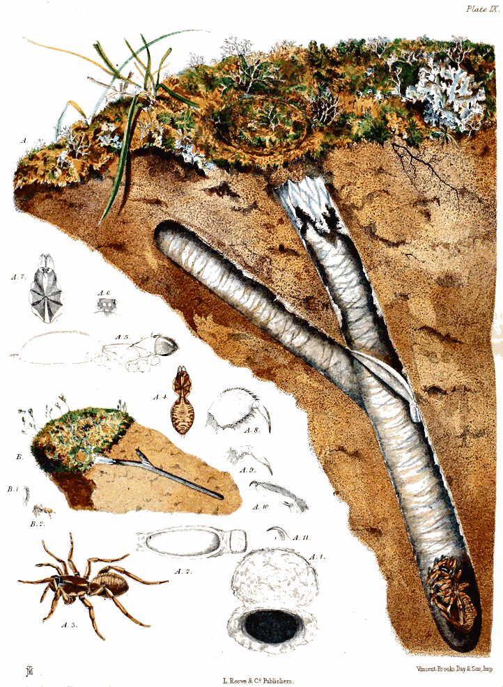 Plate IX., p. 98, fig. A.—The nest of Nemesia meridionalis; A 1, the open surface-door and mouth of the tube of the same; A 2, the inner and upper surface of the lower door; A 3, the spider; A 4, the same deprived of its legs, from a specimen preserved in spirits [figs. A, A 1, 2, 3, and 4 are of the natural size]; A 5, the spider viewed sideways, with the legs [ xi ] removed; A 6, the eyes, viewed from above and in front; A 7, the cephalothorax and falces; A 8, the left hand falx viewed from the inner side; A 9, the fang of the same; A 10, the tarsal joint of the foremost right leg; A 11, one of the two larger and the smallest claw of the same [figs. A 5, 6, 7, 8, 9, 10, and 11, magnified]; B, a mass of earth containing the minute nest of a young spider (N. meridionalis); B 1, the lower door of this nest; B 2, the spider [figs. B, B 1, and 2, of the natural size].