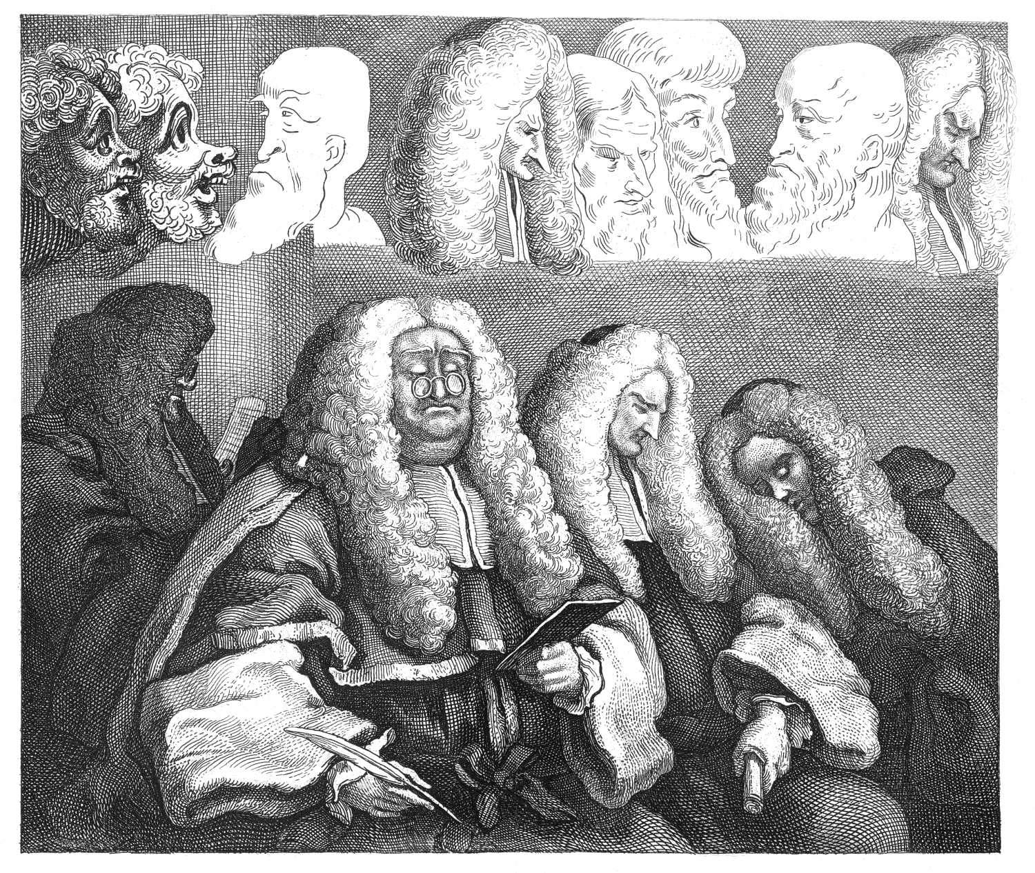 In 1733 his genius became conspicuously known. The third scene of "The Harlot's Progress" introduced him to the notice of the great: at a Board of Treasury, (which was held a day or two after the appearance of[Pg 4] that print), a copy of it was shown by one of the lords, as containing, among other excellences, a striking likeness of Sir John Gonson, a celebrated magistrate of that day, well known for his rigour towards women of the town. From the Treasury each lord repaired to the print-shop for a copy of it, and Hogarth rose completely into fame.