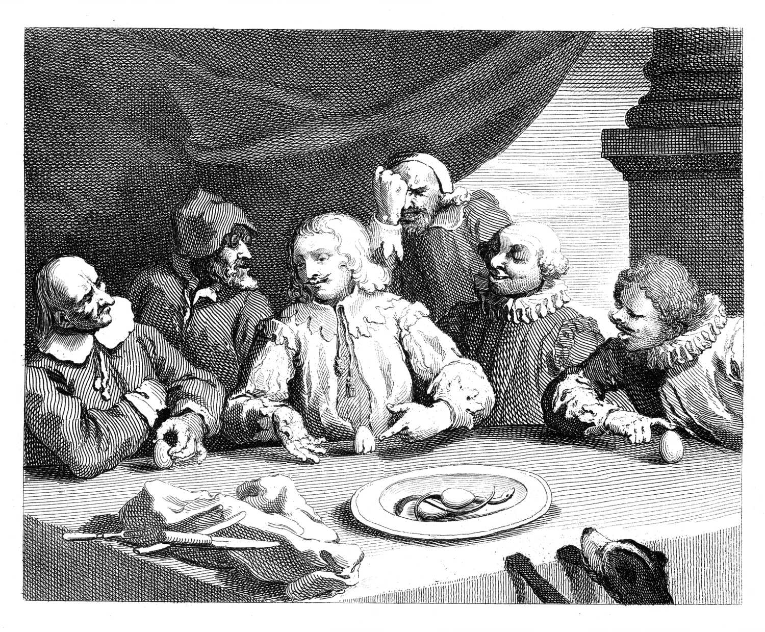 Having seen the ignominious end of the idle apprentice, nothing remains but to represent the completion of the other's happiness; who is now exalted to the highest honour, that of Lord Mayor of London; the greatest reward that ancient and noble city can bestow on diligence and integrity. Our artist has here, as in the last plate, given a loose to his humour, in representing more of the low part of the Lord Mayor's show than the magnificent; yet the honour done the city, by the presence of the Prince and Princess of Wales, is not forgotten. The variety of comic characters in this print serves to show what generally passes on such public processions as these, when the people collect to gratify their childish curiosity, and indulge their wanton disposition, or natural love of riot. The front of this plate exhibits the oversetting of a board, on which some girls had stood, and represents them sprawling upon the ground; on the left, at the back of the scaffold, is a fellow saluting a fair nymph, and another enjoying the joke: near him is a blind man straggled in among the crowd, and joining in the general halloo: before him is a militia-man, so completely intoxicated as not to know what he is doing; a figure of infinite humour. Though Mr. Hogarth has here marked out two or three particular things, yet his chief intention was to ridicule the city militia, which was at this period composed of undisciplined men, of all ages, sizes, and height; some fat, some lean, some tall, some short, some crooked, some lame, and in general so unused to muskets, that they knew not how to carry them. One, we observe, is firing his piece and turning his head another way, at whom the man above is laughing, and at which the child is frightened. The boy on the right, crying, "A full and true account of the ghost of Thomas Idle," which is supposed to have appeared to the Mayor,[Pg 108] preserves the connexion of the whole work. The most obtrusive figure in his Lordship's coach is Mr. Swordbearer, in a cap like a reversed saucepan, which this great officer wears on these grand occasions. The company of journeymen butchers, with their marrow-bones and cleavers, appear to be the most active, and are by far the most noisy of any who grace this solemnity. Numberless spectators, upon every house and at every window, dart their desiring eyes on the procession; so great indeed was the interest taken by the good citizens of London in these civic processions that, formerly, it was usual in a London lease to insert a clause, giving a right to the landlord and his friends to stand in the balcony, during the time of "the shows or pastimes, upon the day commonly called the Lord Mayor's Day."