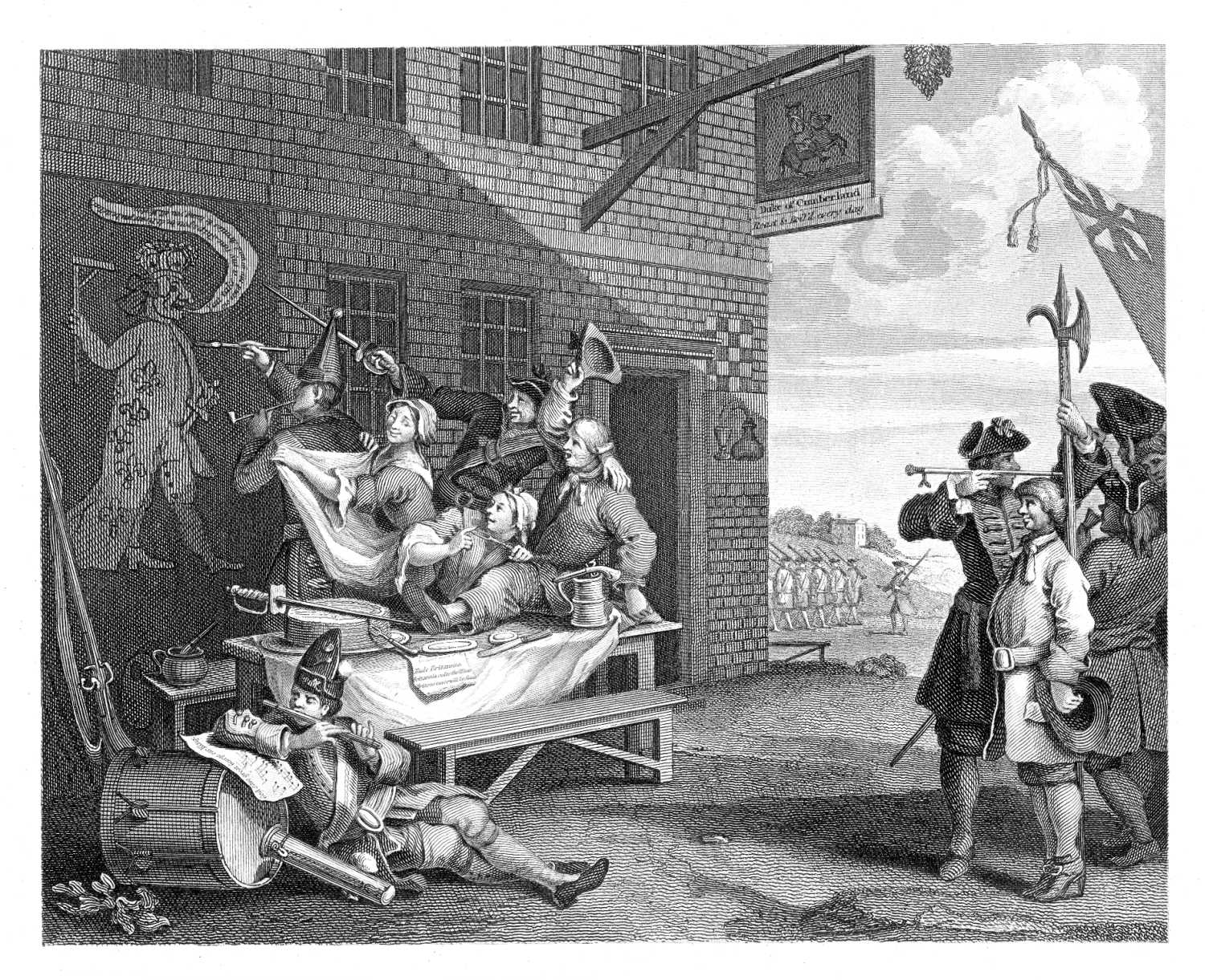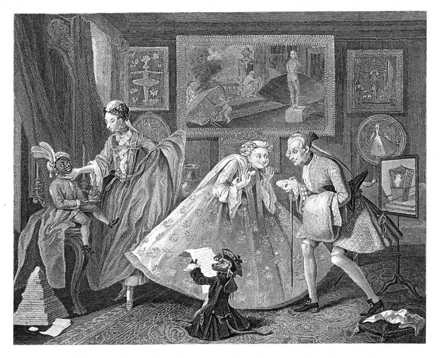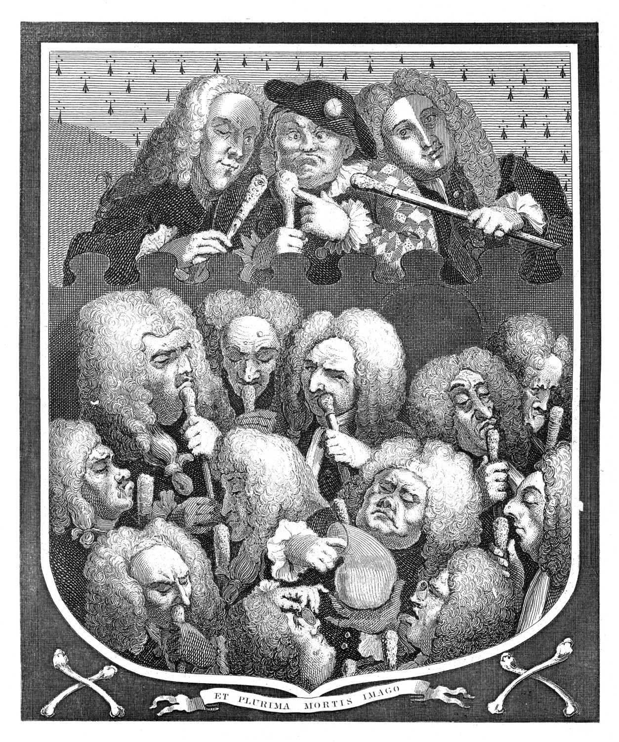 The Rake's Progress was followed by several works in series, viz. "Marriage a-la-Mode, Industry and Idleness, the Stages of Cruelty, and Election Prints." To these may be added, a great number of single comic pieces, all of which present a rich source of amusement:—such as, "The March to Finchley, Modern Midnight Conversation, the Sleeping Congregation, the Gates of Calais, Gin Lane, Beer Street, Strolling Players in a Barn, the Lecture, Laughing Audience, Enraged Musician," &c. &c. which, being introduced and described in the subsequent part of this work, it would far exceed the limits, necessarily assigned to these brief memoirs, here minutely to characterise.[Pg 5]