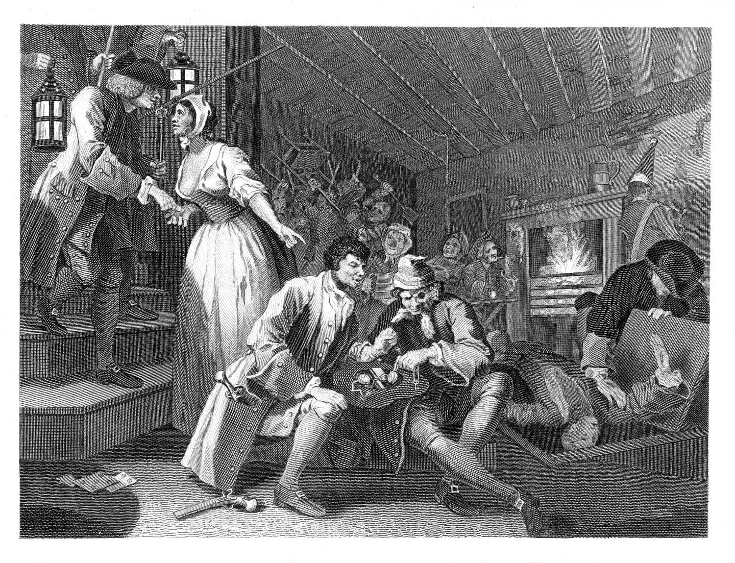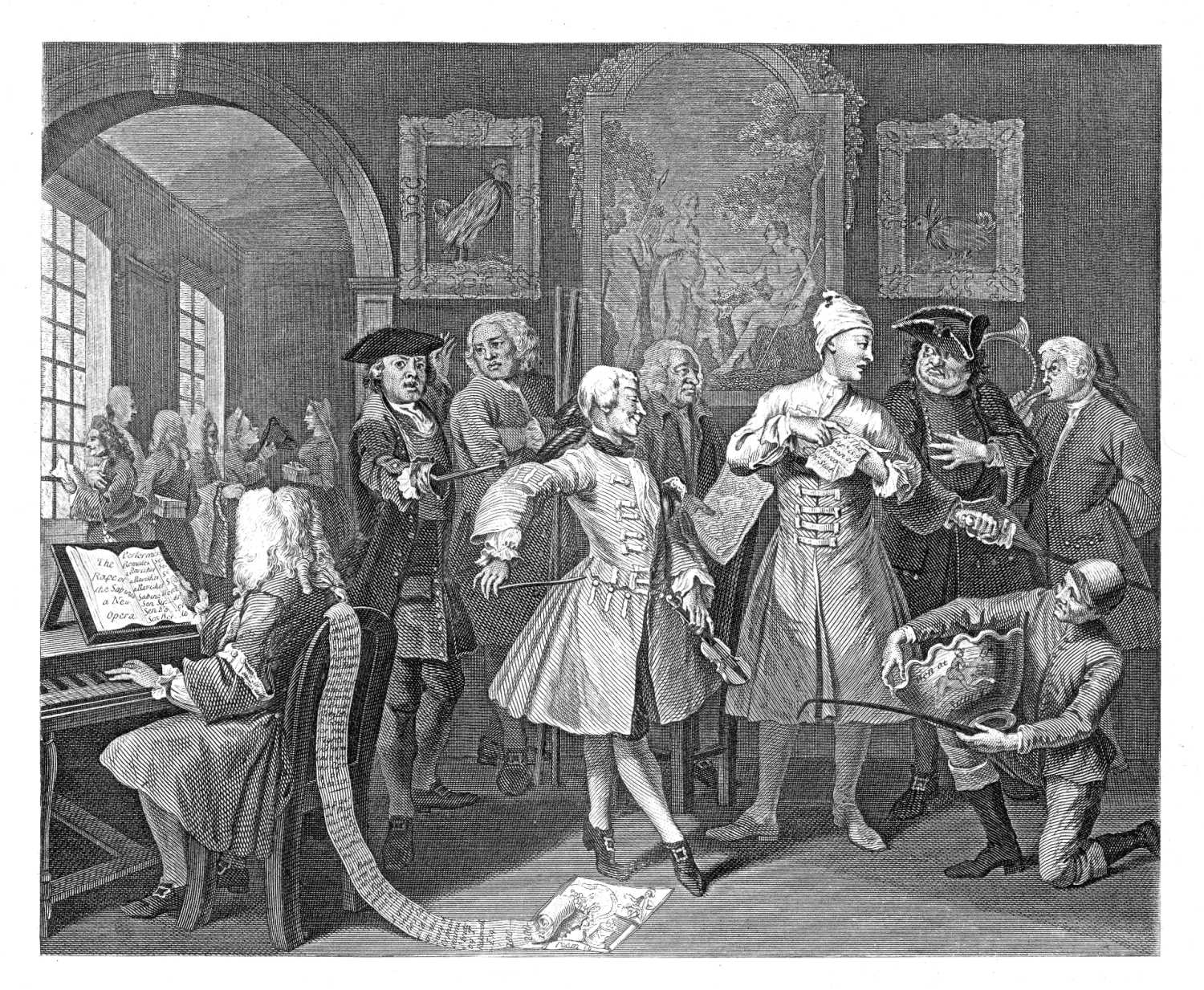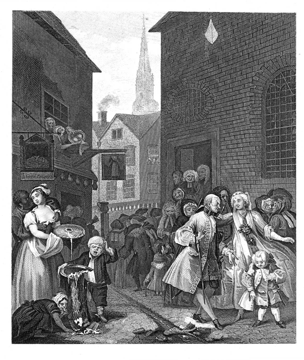 The Rake's Progress was followed by several works in series, viz. "Marriage a-la-Mode, Industry and Idleness, the Stages of Cruelty, and Election Prints." To these may be added, a great number of single comic pieces, all of which present a rich source of amusement:—such as, "The March to Finchley, Modern Midnight Conversation, the Sleeping Congregation, the Gates of Calais, Gin Lane, Beer Street, Strolling Players in a Barn, the Lecture, Laughing Audience, Enraged Musician," &c. &c. which, being introduced and described in the subsequent part of this work, it would far exceed the limits, necessarily assigned to these brief memoirs, here minutely to characterise.[Pg 5]