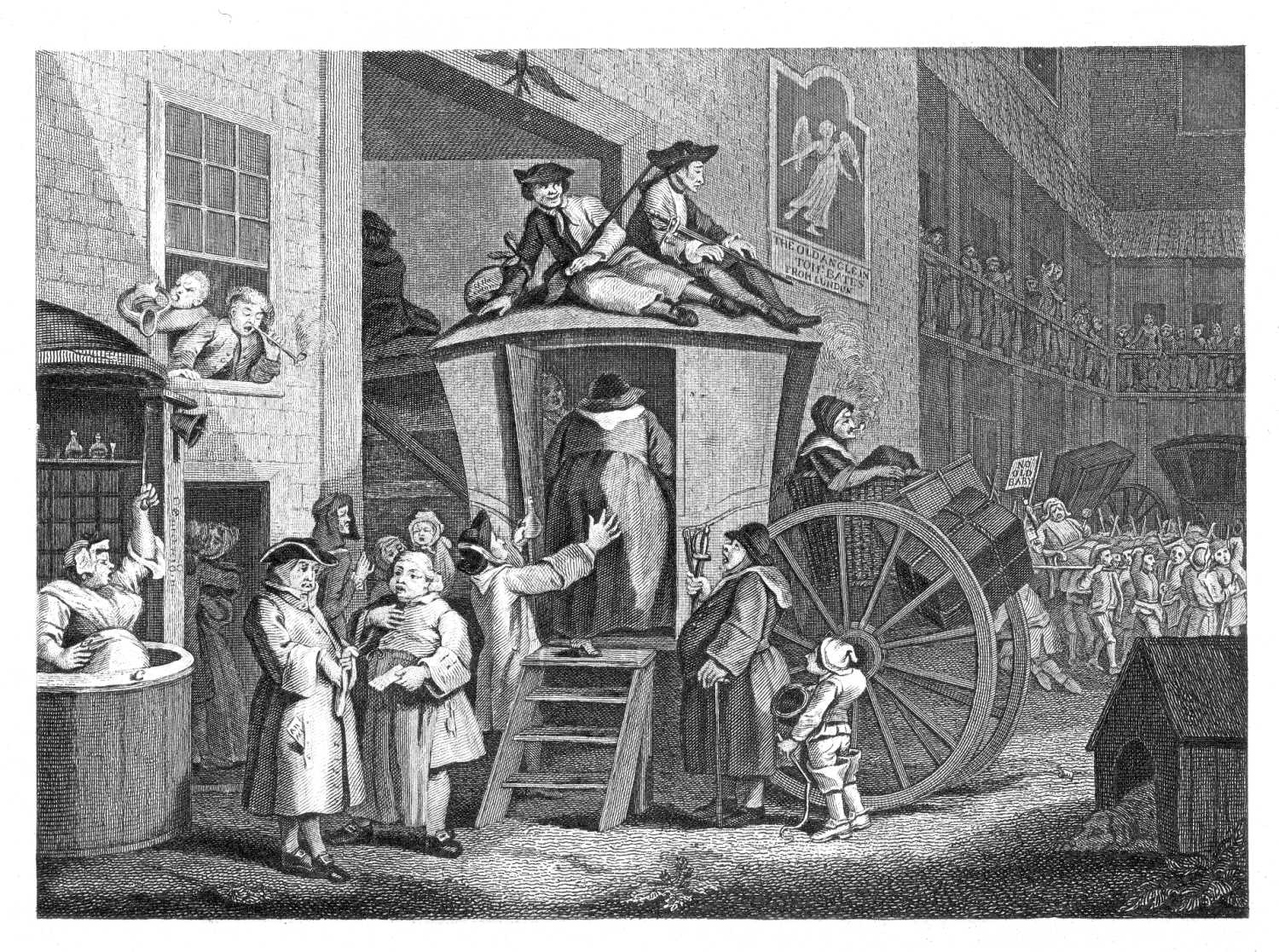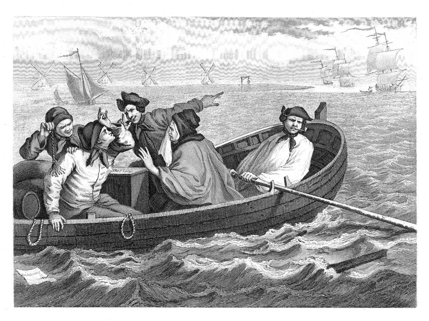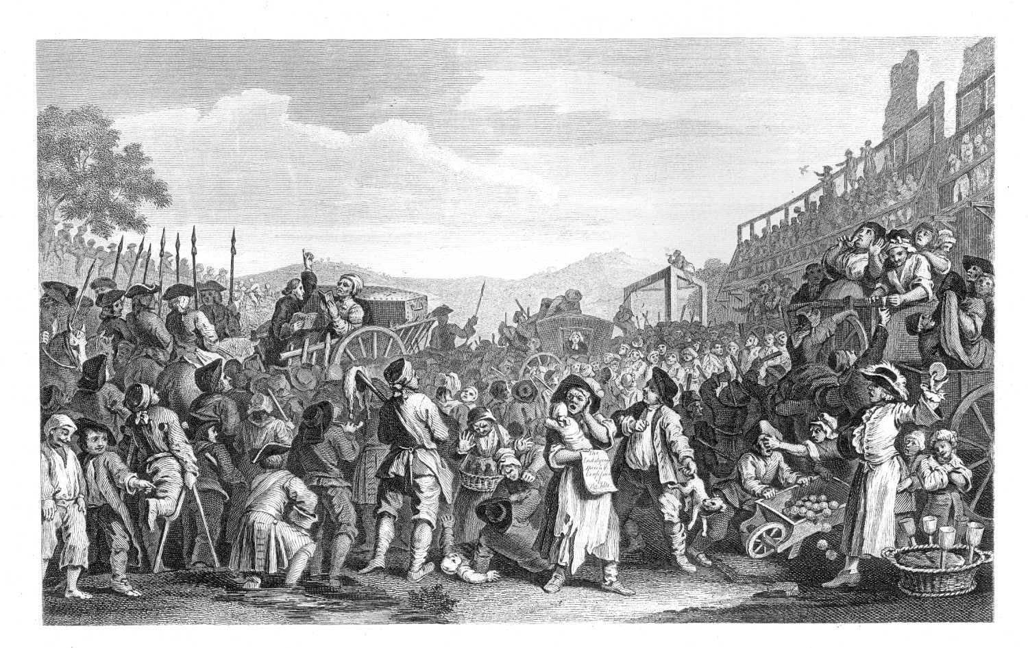 Thus, after a life of sloth, wretchedness, and vice, does our delinquent terminate his career. Behold him, on the dreadful morn of execution, drawn in a cart (attended by the sheriff's officers on horseback, with his coffin behind him) through the public streets to Tyburn, there to receive the just reward of his crimes,—a shameful ignominious death. The ghastly appearance of his face, and the horror painted on his countenance, plainly show the dreadful situation of his mind; which we must imagine to be agitated with shame, remorse, confusion, and terror. The careless position of the Ordinary at the coach window is intended to show how inattentive those appointed to that office are of their duty, leaving it to others, which is excellently expressed by the itinerant preacher in the cart, instructing from a book of Wesley's. Mr. Hogarth has in this print, digressing from the history and moral of the piece, taken an opportunity of giving us a humorous representation of an execution, or a Tyburn Fair: such days being made holidays, produce scenes of the greatest riot, disorder, and uproar; being generally attended by hardened wretches, who go there, not so much to reflect upon their own vices, as to commit those crimes which must in time inevitably bring them to the same shameful end. In confirmation of this, see how earnestly one boy watches the motions of the man selling his cakes, while he is picking his pocket; and another waiting to receive the booty! We have here interspersed before us a deal of low humour, but such as is common on occasions like this. In one place we observe an old bawd turning up her eyes and drinking a glass of gin, the very picture of hypocrisy; and a man indecently helping up a girl into the same cart; in another, a soldier sunk up to his knees[Pg 106] in a bog, and two boys laughing at him, are well imagined. Here we see one almost squeezed to death among the horses; there, another trampled on by the mob. In one part is a girl tearing the face of a boy for oversetting her barrow; in another, a woman beating a fellow for throwing down her child. Here we see a man flinging a dog among the crowd by the tail; there a woman crying the dying speech of Thomas Idle, printed the day before his execution; and many other things too minute to be pointed out: two, however, we must not omit taking notice of, one of which is the letting off a pigeon, bred at the gaol, fly from the gallery, which hastes directly home; an old custom, to give an early notice to the keeper and others, of the turning off or death of the criminal; and that of the executioner smoking his pipe at the top of the gallows, whose position of indifference betrays an unconcern that nothing can reconcile with the shocking spectacle, but that of use having rendered his wretched office familiar to him; whilst it declares a truth, which every character in this plate seems to confirm, that a sad and distressful object loses its power of affecting by being frequently seen.