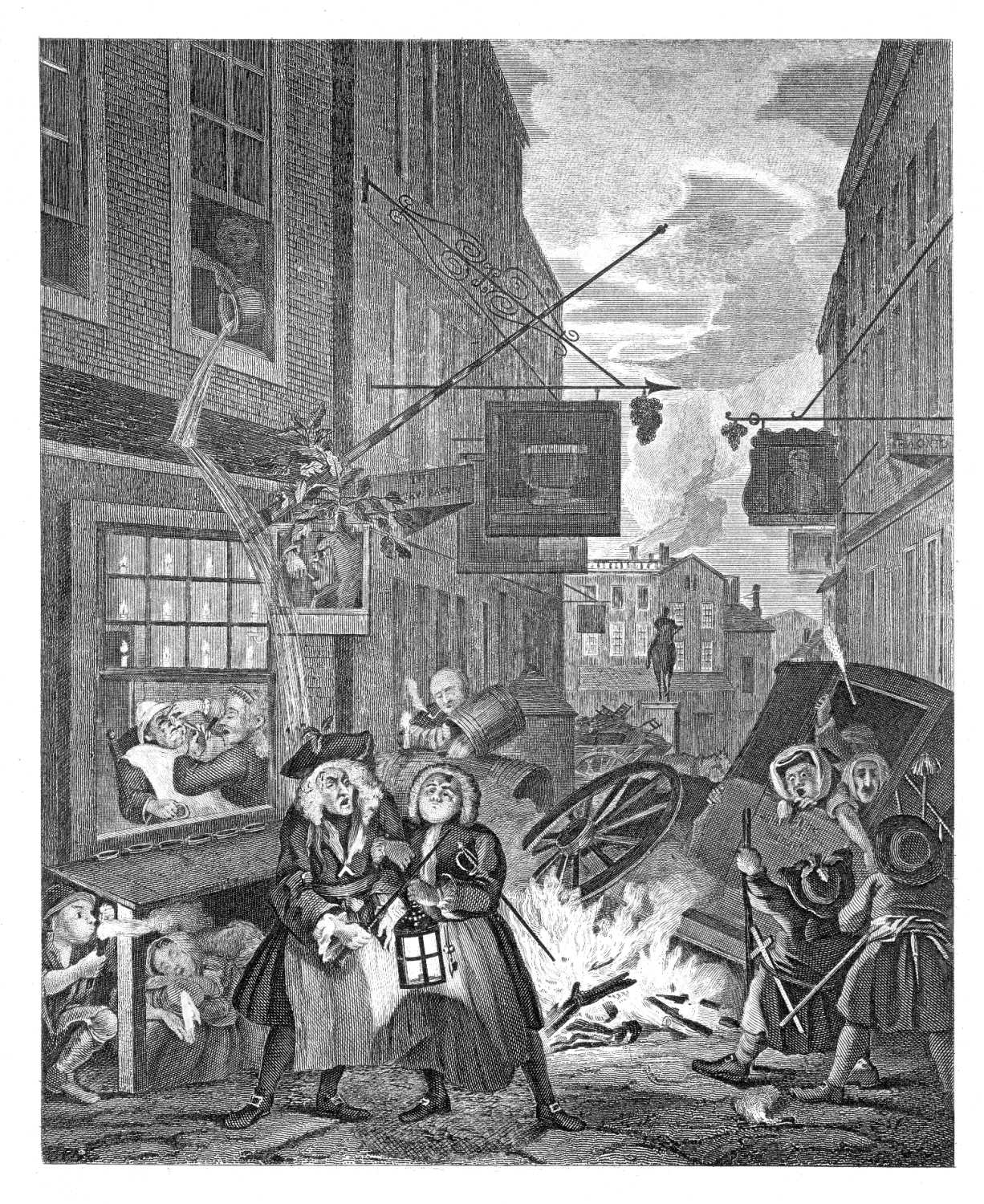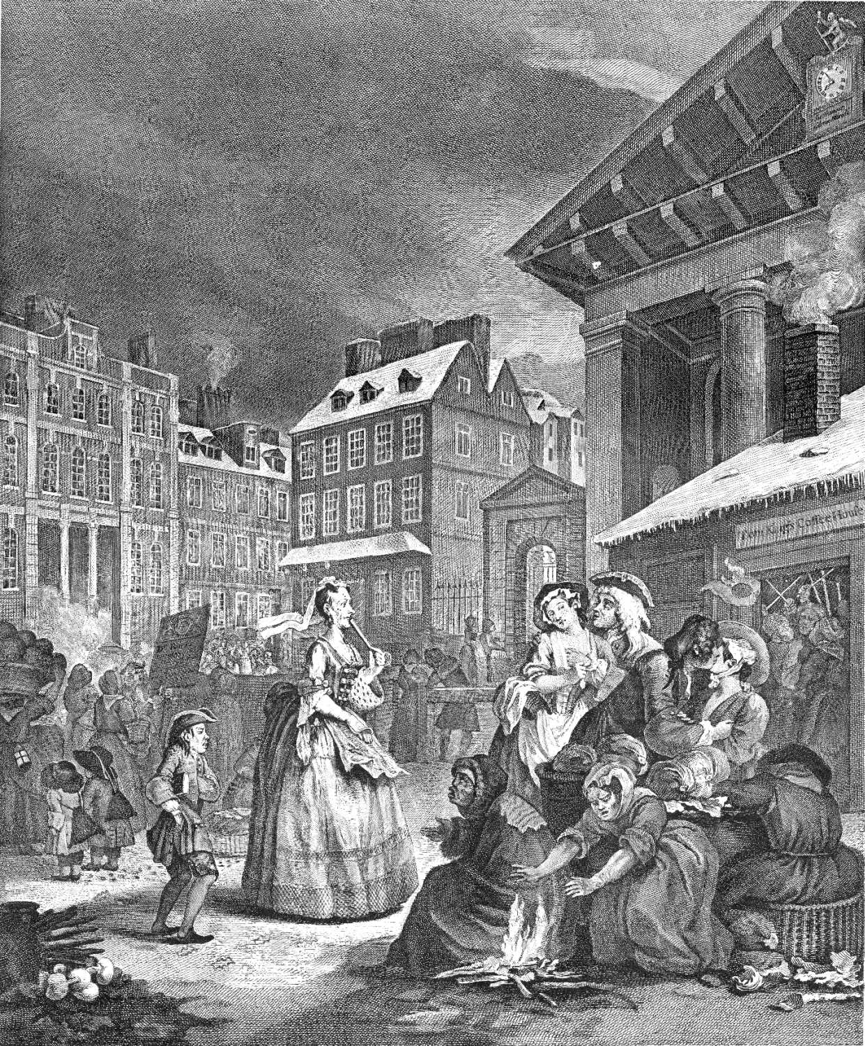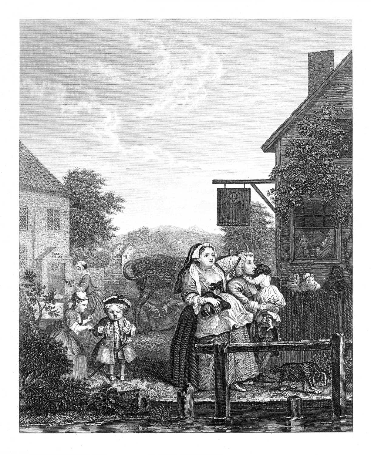 Soon after his marriage, Hogarth resided at South Lambeth; and being intimate with Mr. Tyers, the then spirited proprietor of Vauxhall Gardens, he contributed much to the improvement of those gardens; and first suggested the hint of embellishing them with paintings, some of which were the productions of his own comic pencil. Among the paintings were "The Four Parts of the Day," either by Hogarth, or after his designs.