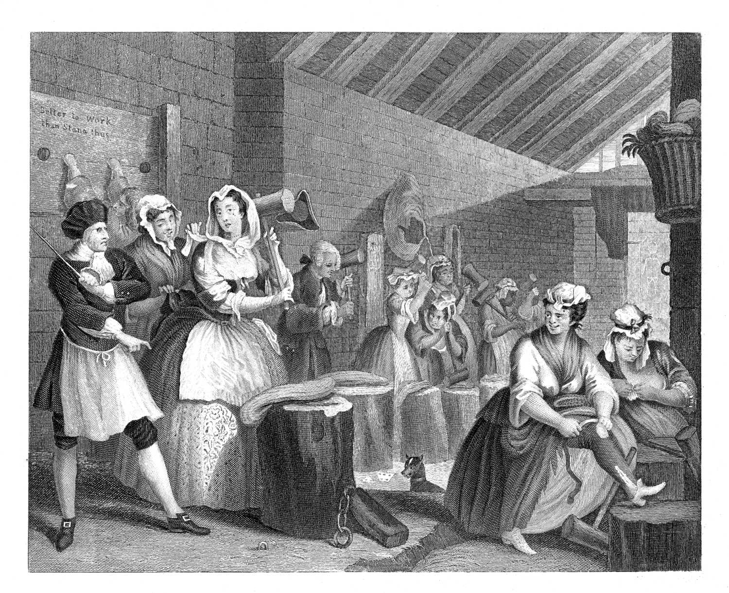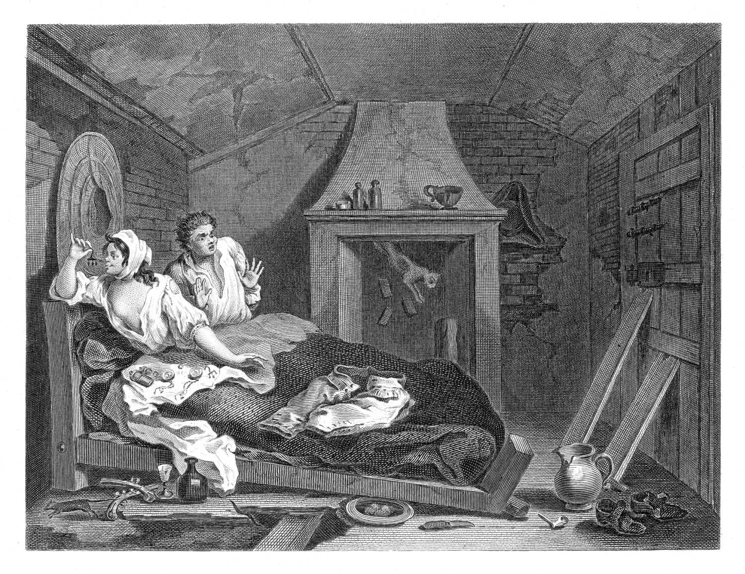 In the year 1730, he clandestinely married the only daughter of Sir James Thornhill, the painter, who was not easily reconciled to her union with an obscure artist, as Hogarth then comparatively was. Shortly after, he commenced his first great series of moral paintings, "The Harlot's Progress:" some of these were, at Lady Thornhill's suggestion, designedly placed by Mrs. Hogarth in her father's way, in order to reconcile him to her marriage. Being informed by whom they were executed, Sir James observed, "The man who can produce such representations as these, can also maintain a wife without a portion." He soon after, however, relented, and became generous to the young couple, with whom he lived in great harmony until his death, which took place in 1733.