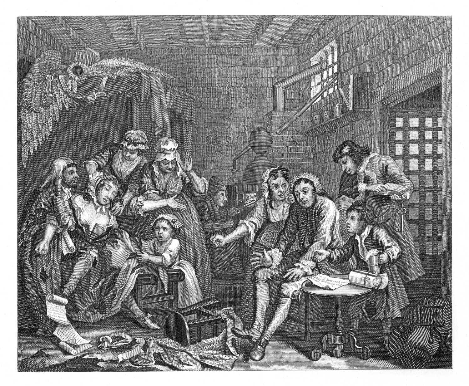 Imagine now this depraved and atrocious youth hand-cuffed, and dragged from his wicked haunt, through the streets to a place of security, amidst the scorn and contempt of a jeering populace; and thence brought before the sitting magistrate, (who, to heighten the scene and support the contrast, is supposed to be his fellow-'prentice, now chosen an alderman,) in order to be dealt with according to law. See him then at last having run his course of iniquity, fallen into the hands of justice, being betrayed by his accomplice; a further proof of the perfidy of man, when even partners in vice are unfaithful to each other. This is the only print among the set, excepting the first, where the two principal characters are introduced; in which Mr. Hogarth has shown his great abilities, as well in description, as in a particular attention to the uniformity and connexion of the whole. He is now at the bar, with all the marks of guilt imprinted on his face. How, if his fear will permit him to reflect, must he think on the happiness and exaltation of his fellow-'prentice on the one hand, and of his own misery and degradation on the other! at one instant, he condemns the persuasions of his wicked companions; at another, his own idleness and obstinacy: however, deeply smitten with his crime, he sues the magistrate, upon his knees, for mercy, and pleads in his cause the former acquaintance that subsisted between them, when they both dwelt beneath the same roof, and served the same common master: but here was no room for lenity, murder was his crime, and[Pg 104] death must be his punishment; the proofs are incontestable, and his mittimus is ordered, which the clerk is drawing out. Let us next turn our thoughts upon the alderman, in whose breast a struggle between mercy and justice is beautifully displayed. Who can behold the magistrate, here, without praising the man? How fine is the painter's thoughts of reclining the head on one hand, while the other is extended to express the pity and shame he feels that human nature should be so depraved! It is not the golden chain or scarlet robe that constitutes the character, but the feelings of the heart. To show us that application for favour, by the ignorant, is often idly made to the servants of justice, who take upon themselves on that account a certain state and consequence, not inferior to magistracy, the mother of our delinquent is represented in the greatest distress, as making interest with the corpulent self-swoln constable, who with an unfeeling concern seems to say, "Make yourself easy, for he must be hanged;" and to convince us that bribery will even find its way into courts of judicature, here is a woman feeing the swearing clerk, who has stuck his pen behind his ear that his hands might be both at liberty; and how much more his attention is engaged to the money he is taking, than to the administration of the oath, may be known from the ignorant, treacherous witness being suffered to lay his left hand upon the book; strongly expressive of the sacrifice, even of sacred things, to the inordinate thirst of gain.