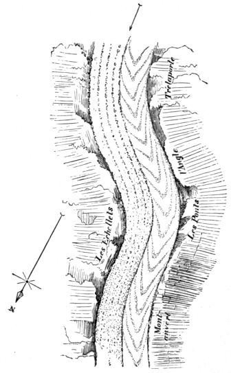 During my residence at the Bel Alp this year, a catastrophe occurred which renders, for the time being, the description of the Märgelin See given in § 50 inappropriate. In company with two young friends I had descended the glacier and passed through the gorge of the Massa. On our return to the Bel Alp we found the domestics of the hotel leaning out of the windows and looking excitedly towards the glacier. From it proceeded a sound which resembled the roar of a cataract. The servants remarked that the Märgelin See must have broken loose. This was the case. For a time, however, the water flowed beneath the glacier; but at a point about midway between the Bel Alp and the Æggischhorn, it broke forth on the Æggischhorn side, and formed a torrent between the glacier and the slope of the mountain. In some places this river was more than sixty yards wide, at others it was contracted to less than one-fifth of this width. Broken cascades of great height were formed here and there by successive ledges of ice, the torrent leaping with indescribable fury [xii] from ledge to ledge, and sending a smoke of spray into the air. At one place the bottom of the torrent was deep soft sand, which, after the water had passed, could be seen to have been tortured into huge funnels by the whirling eddies overhead.