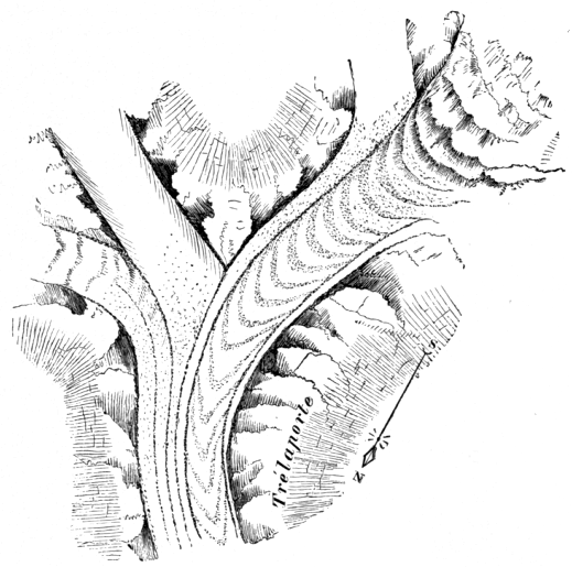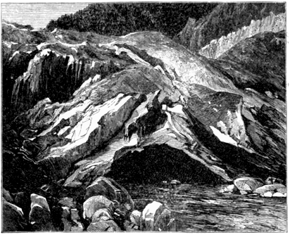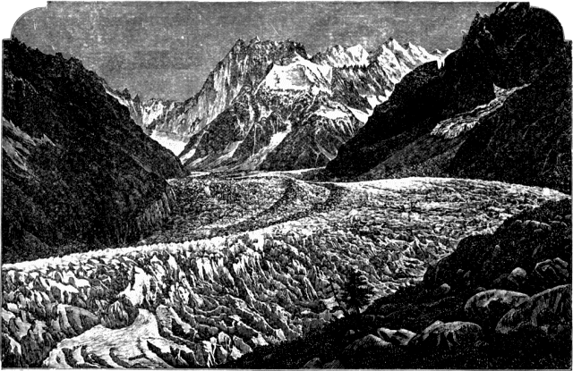 After an absence of twelve years, I visited the Mer de Glace last June. It exhibited in a striking degree that excess of consumption over supply which, if continued, would eventually reduce the Swiss glaciers to the mere spectres of their former selves. When I first saw the Mer de Glace its ice-cliffs towered over Les Mottets, and an arm of the Arveiron, issuing from the cliffs, plunged as a powerful cascade down the rocks. The ice has now shrunk far behind them. A huge moraine, left behind by the retreating glacier, will mark, for some time to come, its recent magnitude. The vault of the Arveiron has dwindled considerably. The way up to the Chapeau lies on the top of a lateral moraine, reached a few years ago by the surface of the glacier, the present surface lying far below. The visible and continual breaking away of the moraines, left thus stranded on the mountain flank, explains the absence of ancient ridges on the mountains where the slopes are steep. The ice-cascades of the Géant has suffered much from the general waste. Its crevasses are still wild, but the ice-cliffs and séracs of former days are but poorly represented to-day.