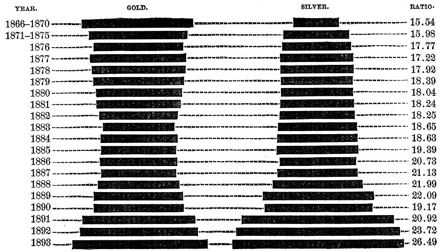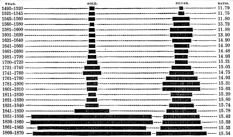 Well, the estimates vary greatly. Soetbeer places the amount at $1,407,000,000 by the close of 1860; but Tooke and Newmarche have put it about $100,000,000 less. In the same era the production of silver varied but a trifle from $40,000,000 a year. A committee of the United States Senate, appointed for investigating the facts, reported that in the twelve years ending with 1860 the gold produced was $1,339,400,000; and in the next thirteen years, ending with 1873, it was $1,411,825,000. Thus, in the thirteen years following the California discovery the stock of gold in the world was doubled, and in the twenty-five years ending with 1873 it was more than tripled. Several economic writers have made the statement very much stronger than this, and M. Chevalier, in his famous argument for the demonetization of gold, written in 1857, declares that the production of gold as compared with silver had increased fivefold in six years and fifteenfold in forty years, and that, owing to the export of silver to Asia and its use in the arts, there would, in a very little while, be no possible method of maintaining the parity of the two metals in money at any ratio which would be honest and profitable.